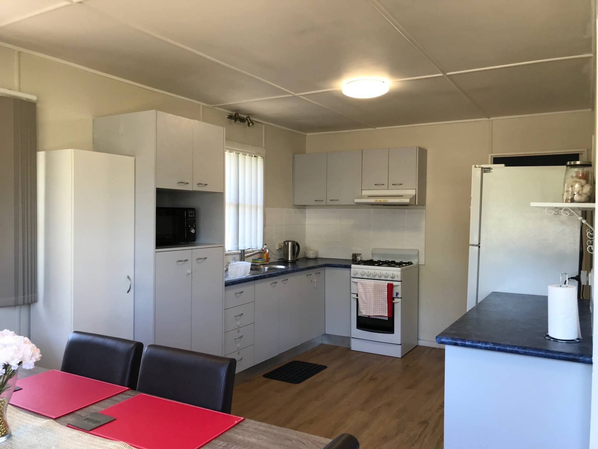 Great bench and cupboard space is supplied in the neat kitchen with gas, upright stove.