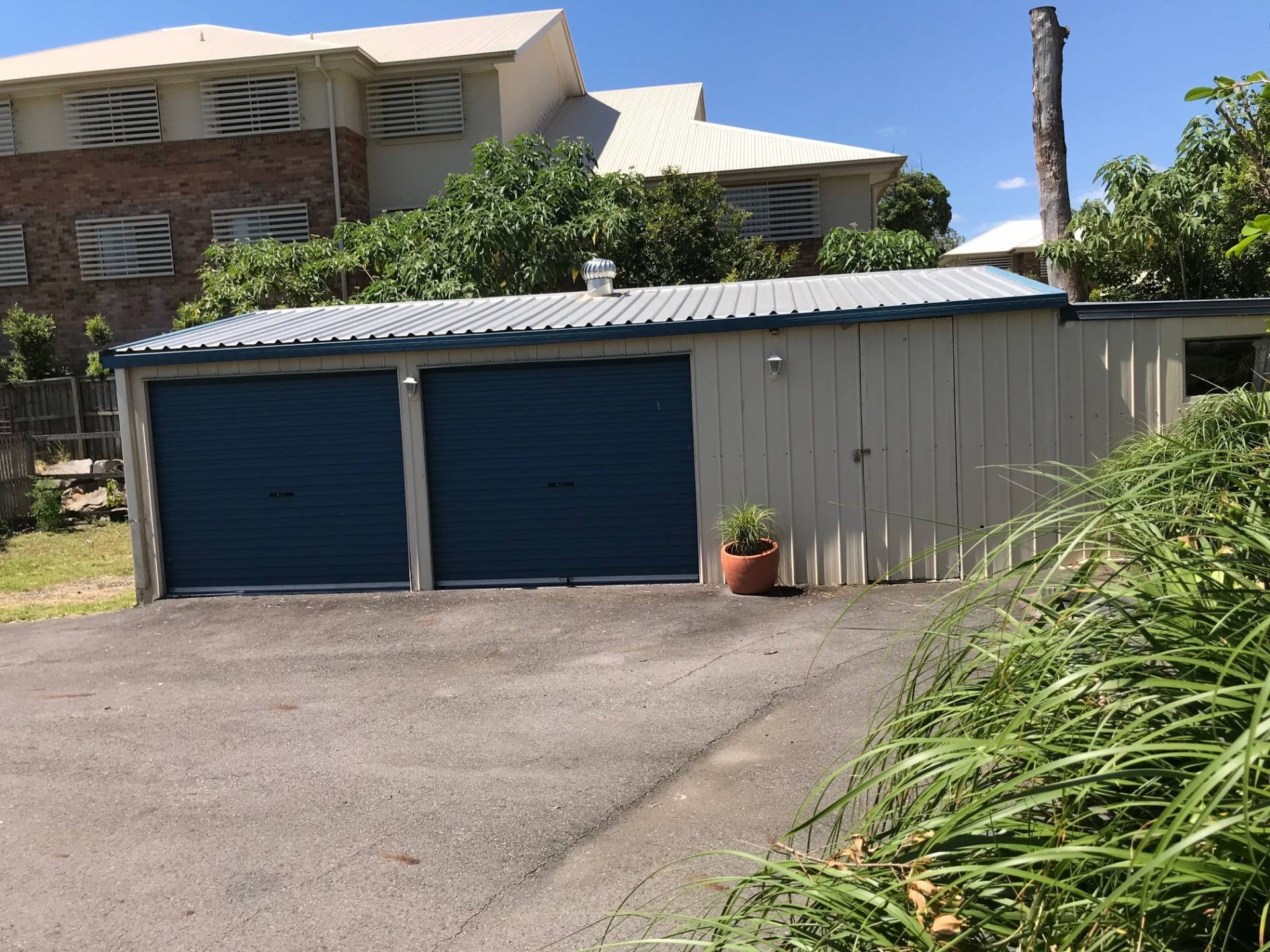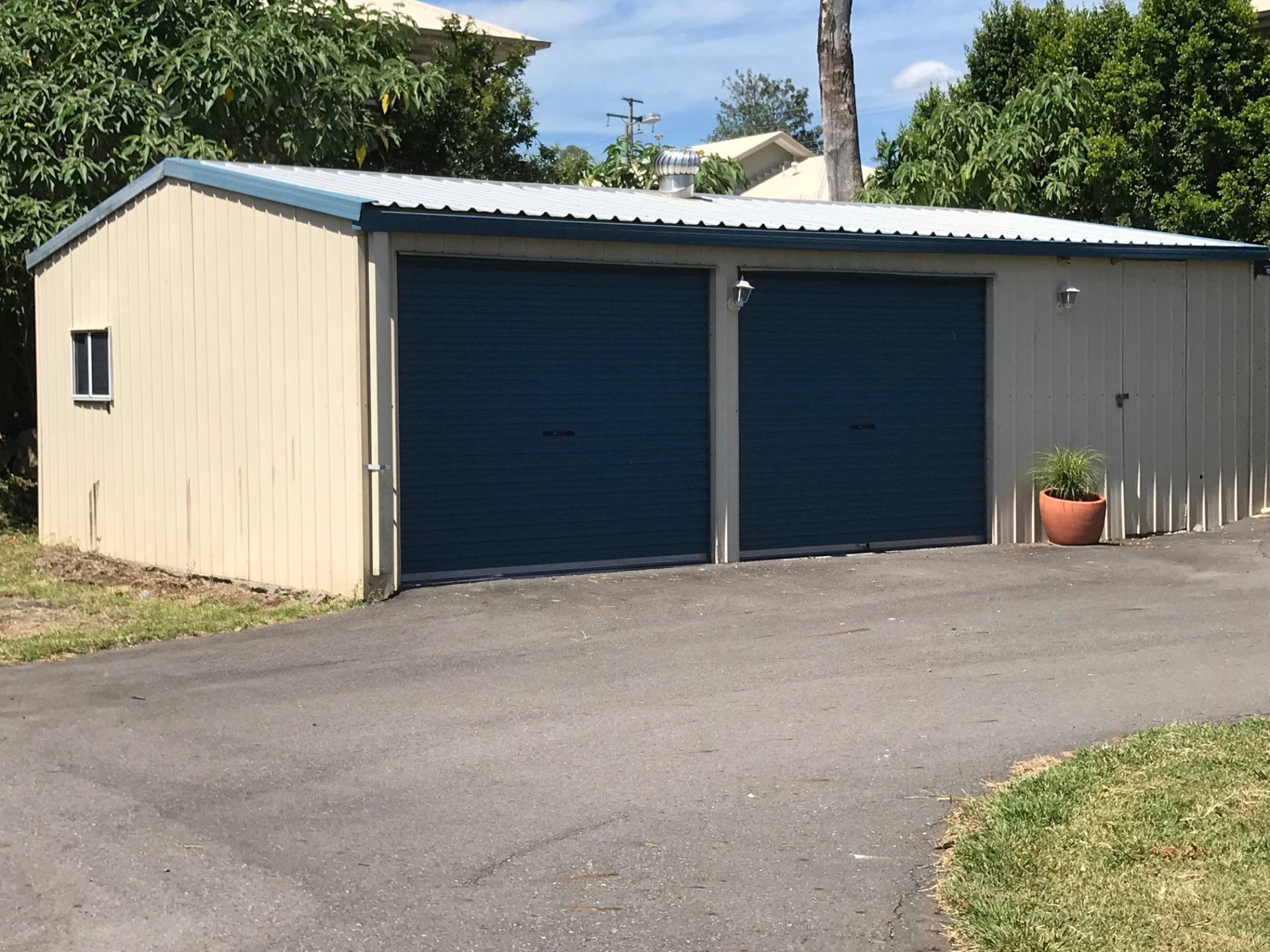 Side access is provided to the three bay shed at the rear with two car lock-up and workshop area.