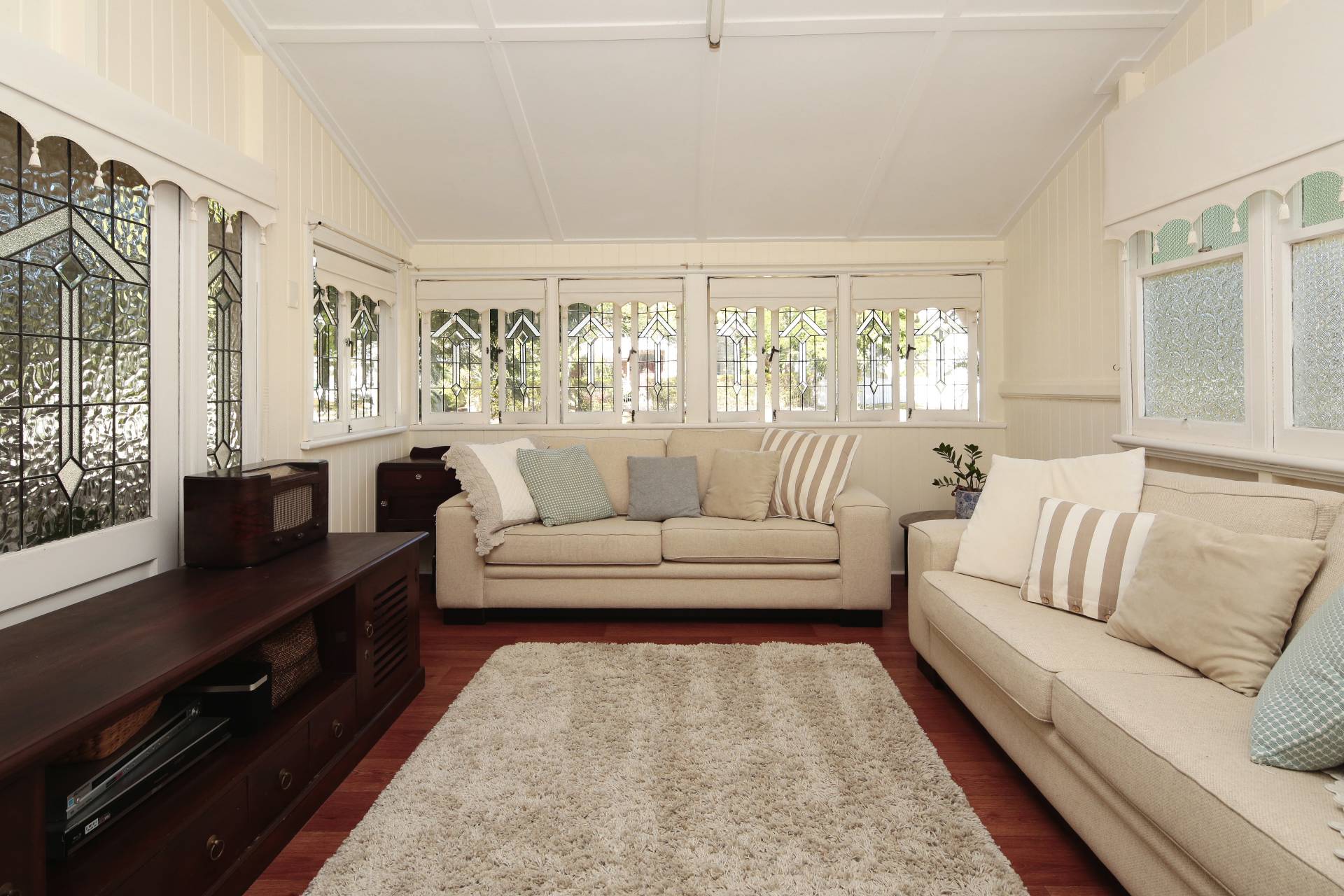 The striking art deco windows frame the comfortable sunroom to the front with matching leadlight doors opening to the front porch. These gorgeous windows feature throughout the home including the full length of the east facing sleepout/office area.