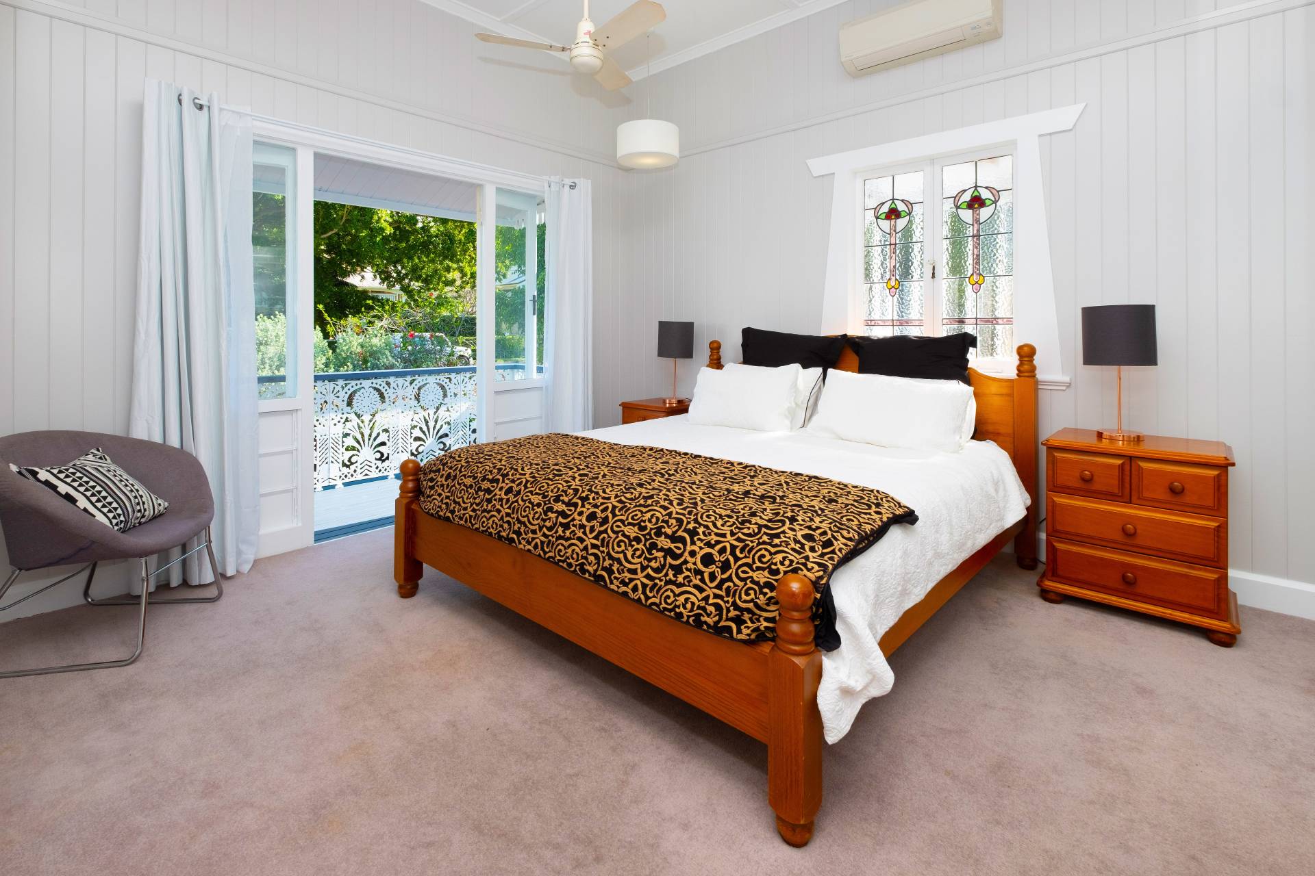 Cosy carpet in the bedrooms is soft underfoot. Romance is abound in the main bedroom with Juliette balcony with lace iron work with thistle pattern and lead light windows with art deco architrave treatment. Including the large front area and enclosed side verandah there is a formal lounge, separate formal dining – rumpus at the rear and an option for a fourth bedroom upstairs or a guest area.
