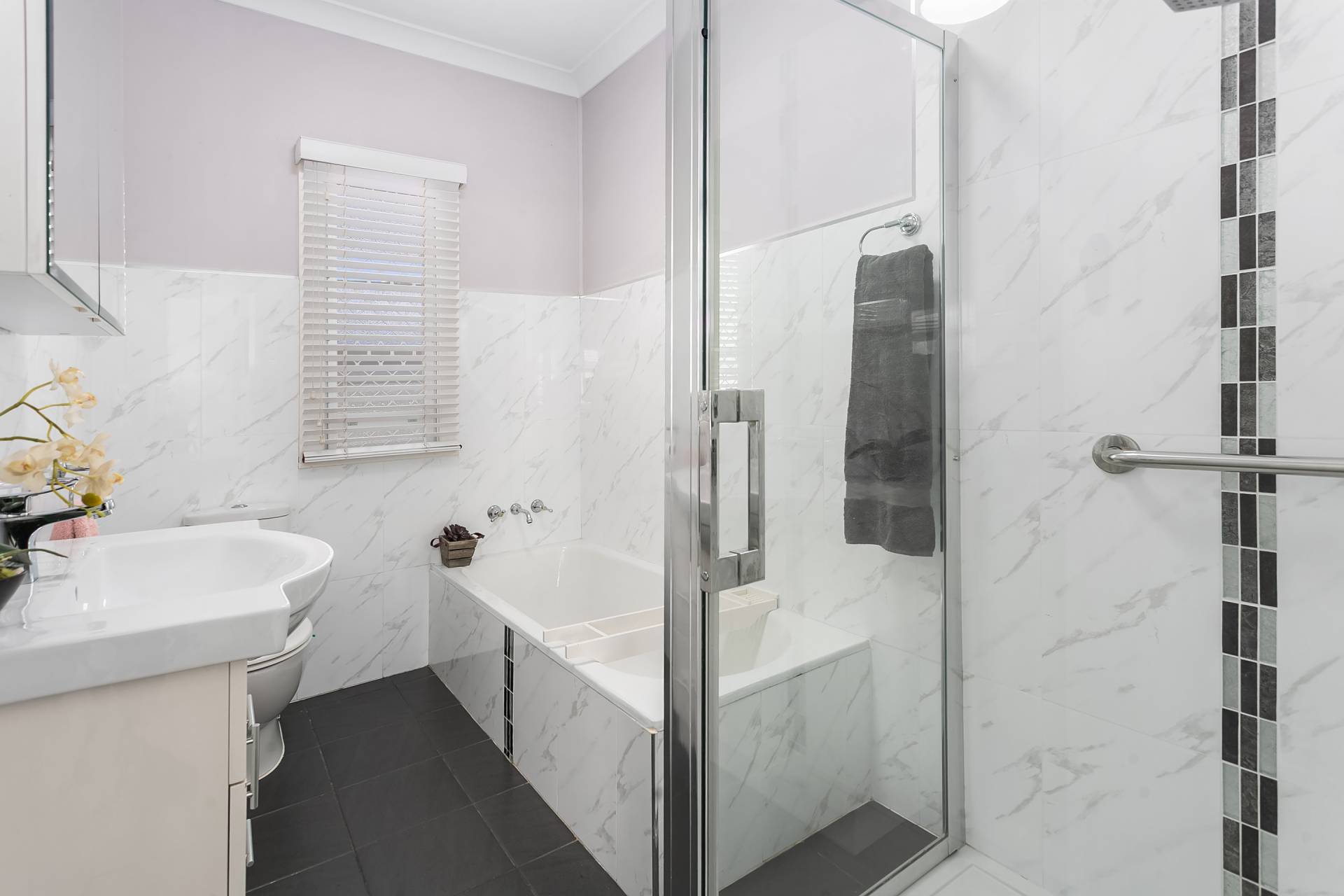 Professional, tasteful renovation using popular grey and white colour pallet