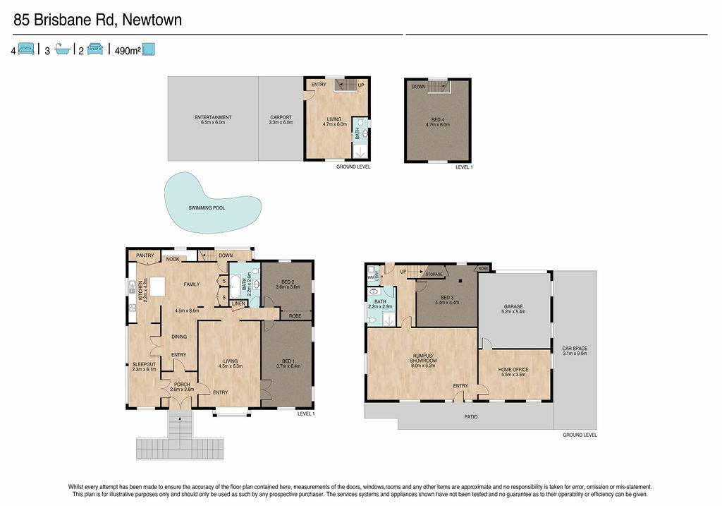 Looking for size? A space to work from home? An area for guests? This is definitely one with the lot!!!  Located in a high profile location you could easily run a business from home totally separate from the family living area whilst having the convenience of internal stairs for access if necessary. Great space under the main house with separate access. Includes large rumpus – showroom – office space x 2 – bathroom and lock up car accommodation with internal access. Massive rooms upstairs including main living area with bay window.  Separate dining, family and kitchen, sleepout / office, huge main bedroom and second bedroom.  Large central bathroom on this level.  A separate studio to the rear provides a loft bedroom plus living downstairs and bathroom. Ideal guest accommodation.  A huge entertainment area overlooks the in-ground pool and will provide space for hours of relaxation and entertainment.  There are six outside car spaces, a carport and lock up garage.  So many opportunities here in such a multi-use high benefits property. Absolute perfect home for the large family or those who need a lot of space.