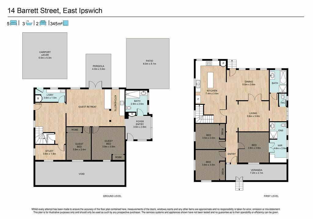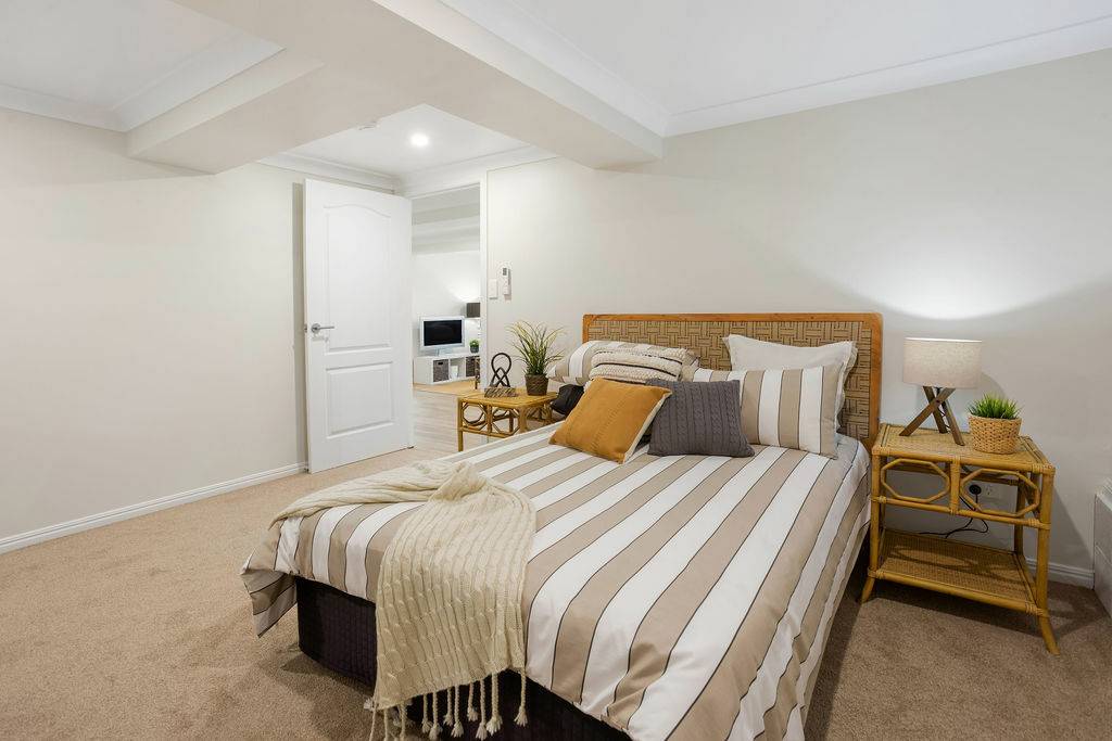 The high standard of fittings and workmanship continues to the ground level where a practical kitchenette and bathroom provide functionality to the space offered which includes rumpus, home office space with separate study and excellent storage and two additional built-om guest rooms are multi-purpose and air conditioned.