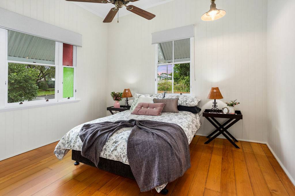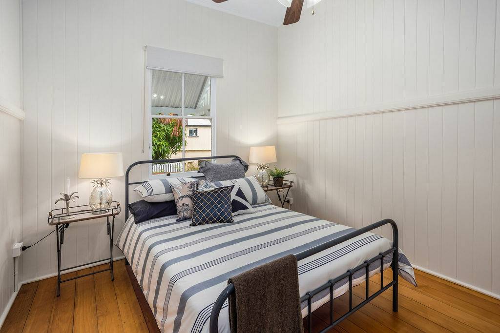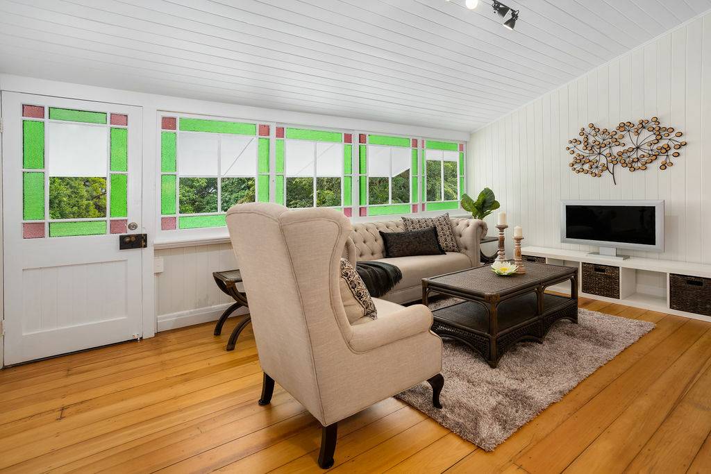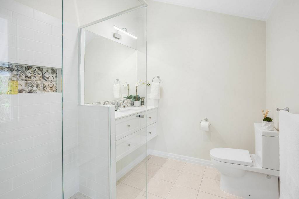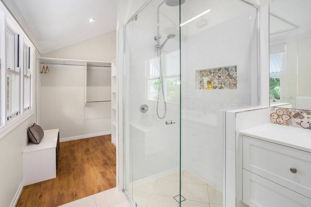 The main level with crisp white walls and open plan living provides 3 large built in bedrooms off the wide hall. The main with large ensuite and walk in robe also featuring sash window with coloured glass panels.