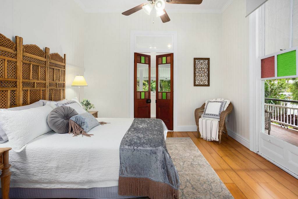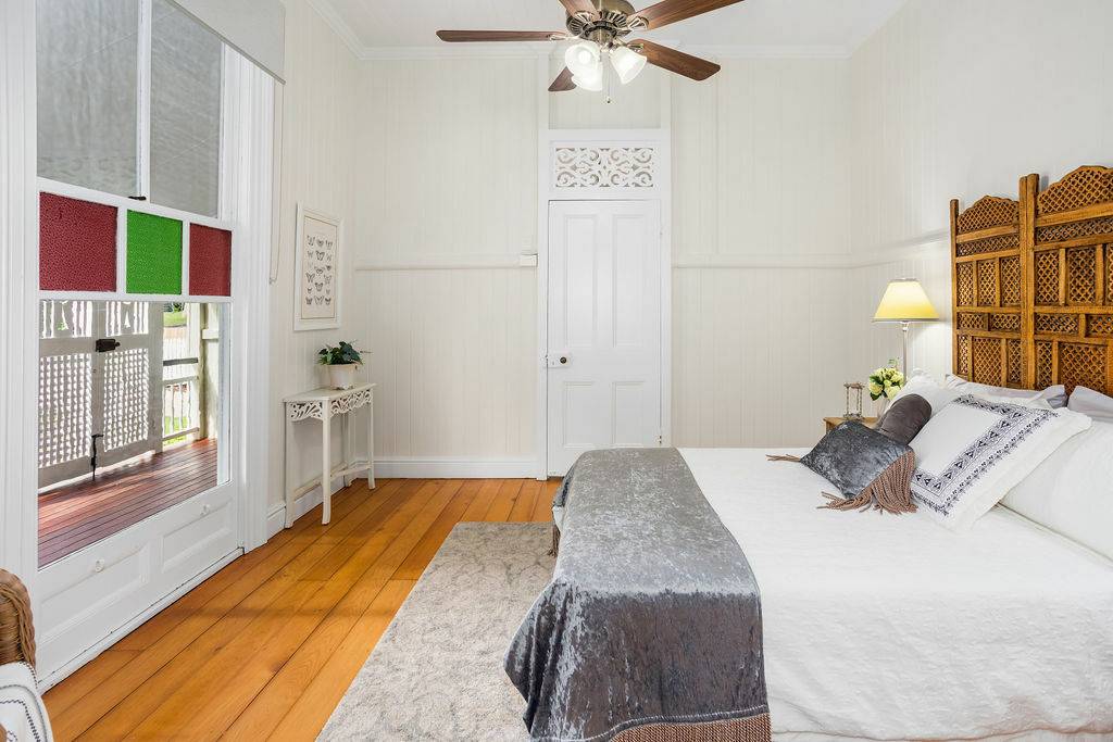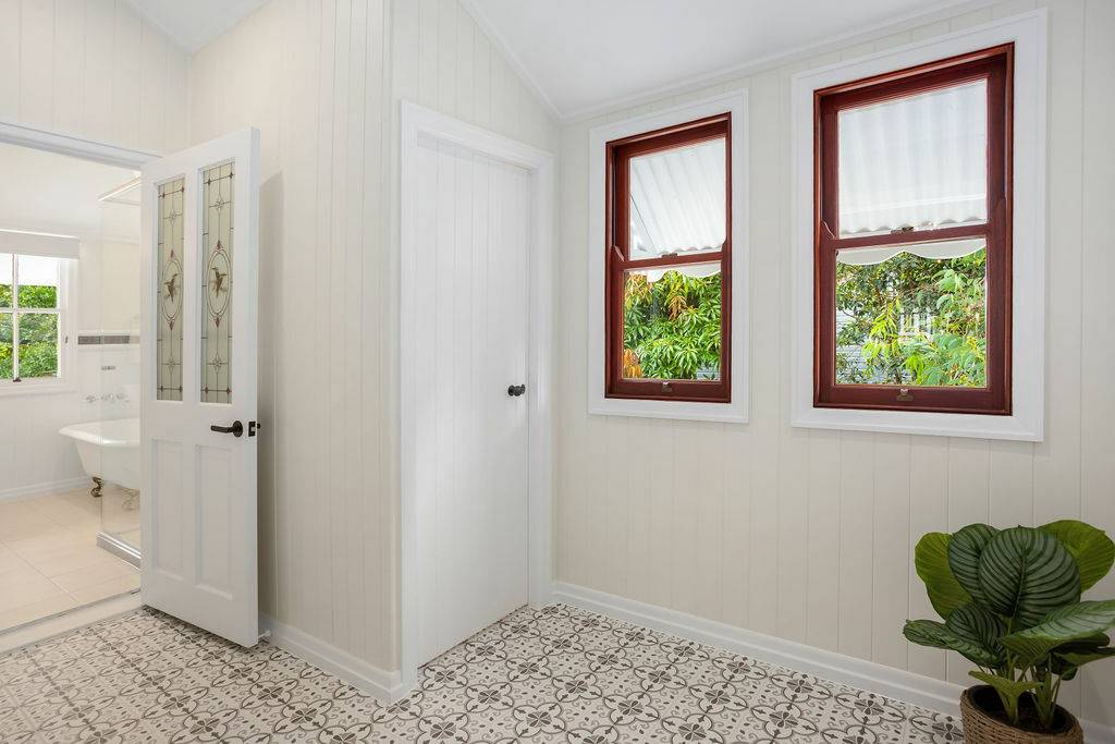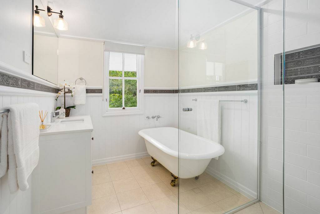French doors may be used to separate living areas and add a touch of class to these spaces. Subtle heritage themed tiles lead to the separate water closet and main bathroom with claw footbath and separate shower. The entire top level has fully ducted air conditioning ceiling fans and quality lighting.