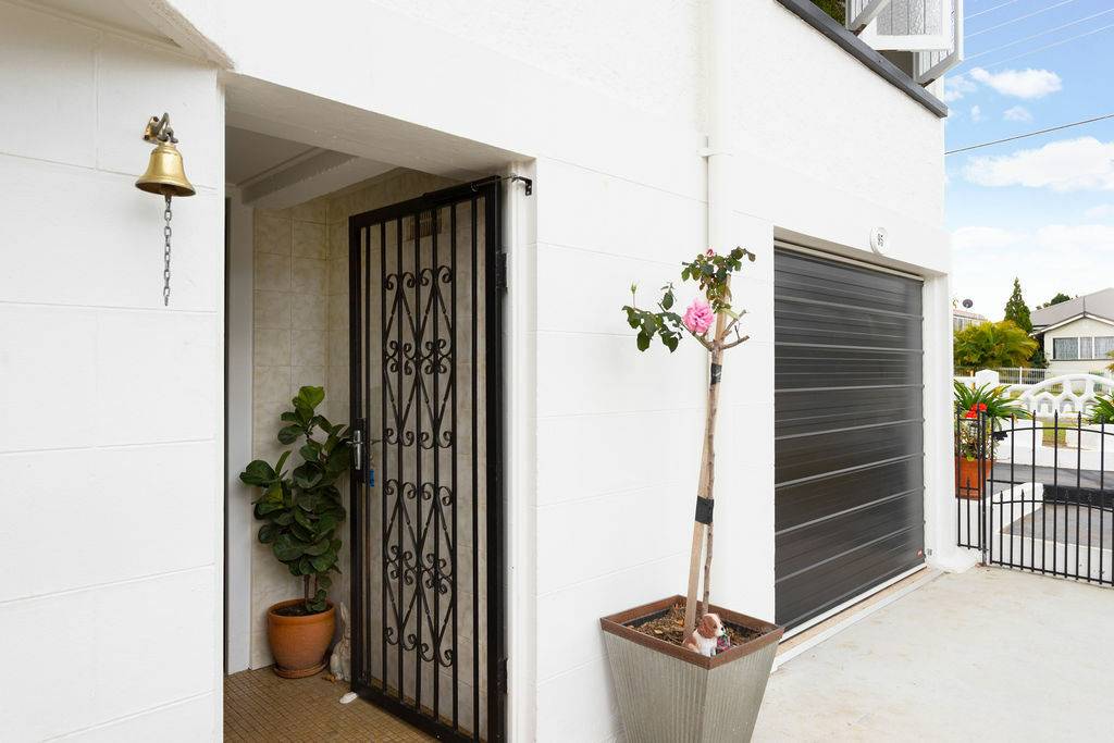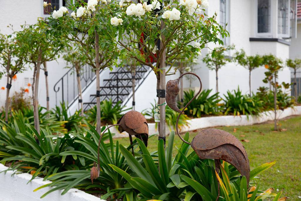 Striking street appeal with art deco lead light windows making a statement against the pristine white exterior with black trim. This welcoming curved path is flanked by white standard roses agapanthus manicured lawns and framed by a decorative concrete fence.