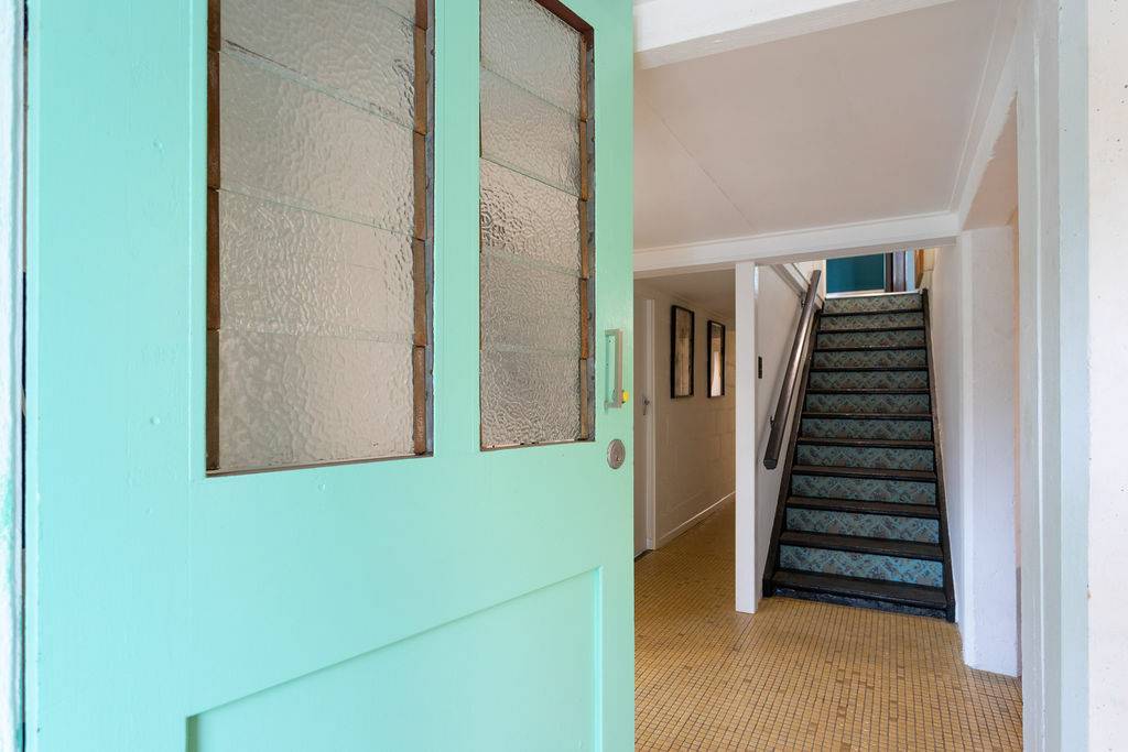 Formal entry leads through a hall to fabulous original storage with hand stenciled doors and internal stairs.