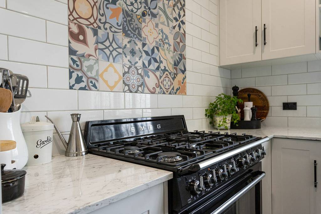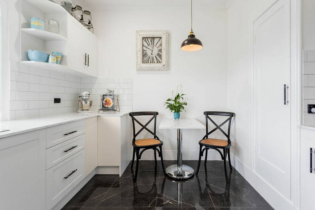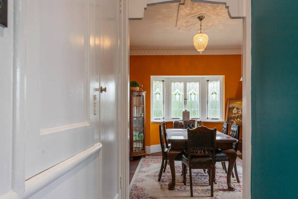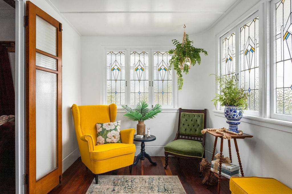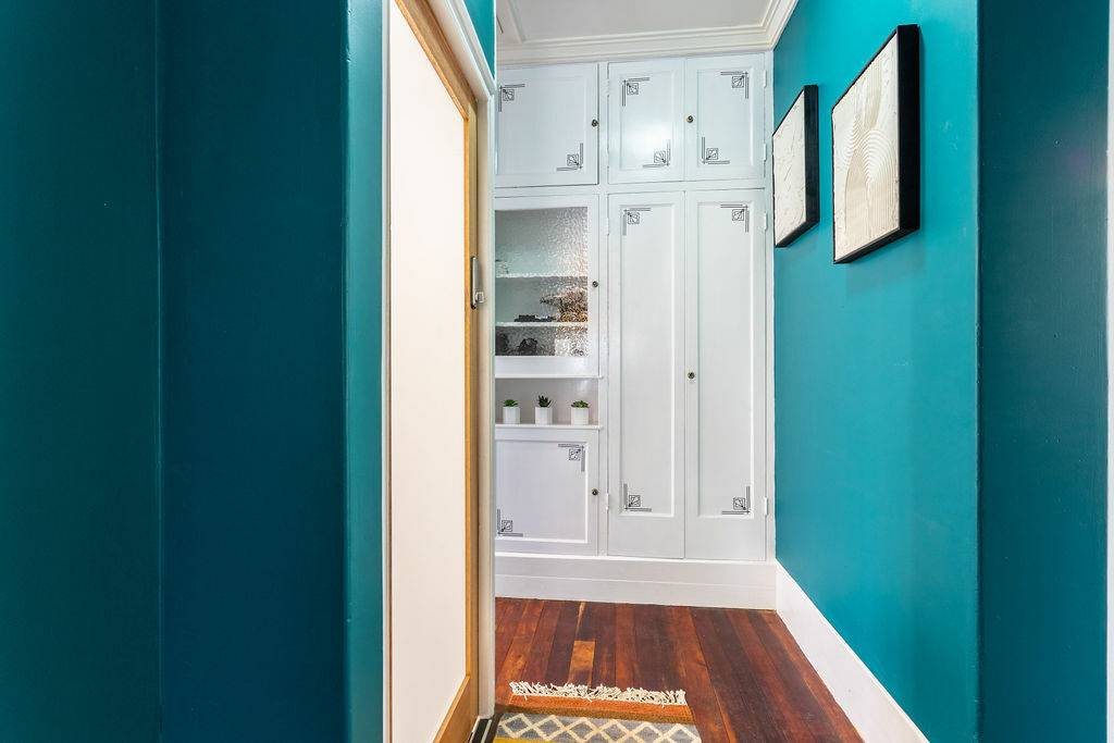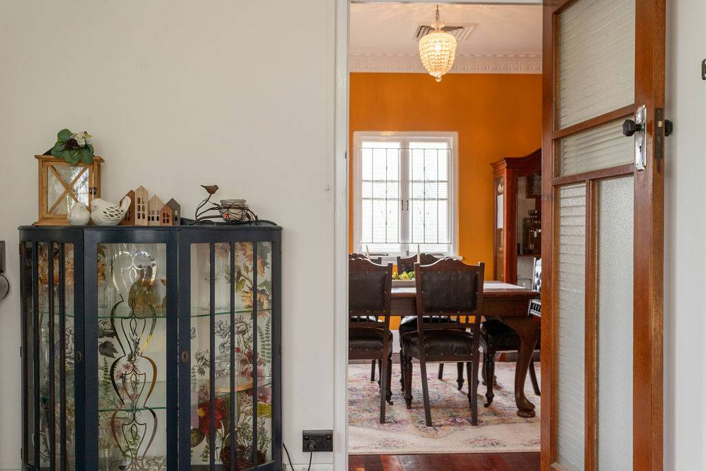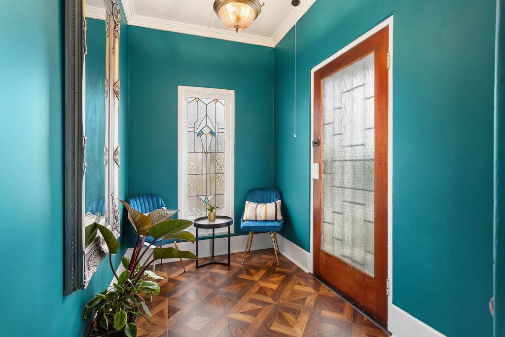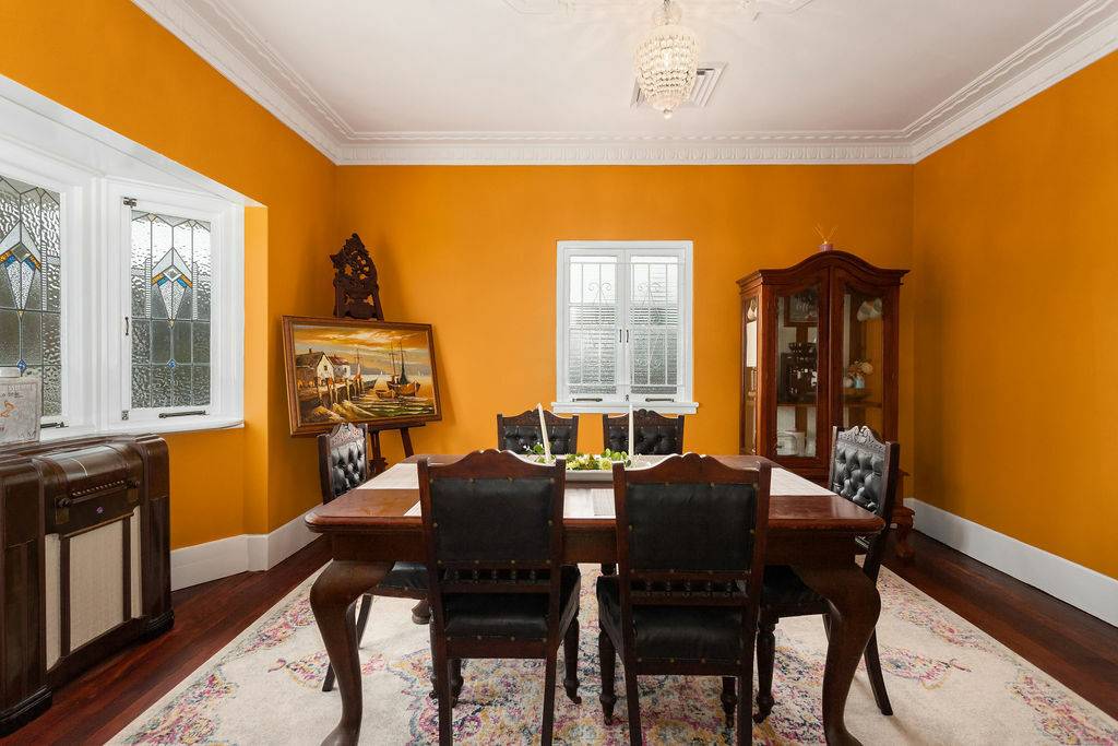 The third bedroom/sunroom on the northeast corner is accessed through french doors. The second bedroom with moody tones is tucked away in the southern corner and serviced by a new  black and white bathroom in the theme of the house. Brand new stunning kitchen features white subway tiles, marble bench tops, original cabinetry complemented by additional cupboards, culminating with a feature tile mosaic capturing all of the vivid colours throughout. The hero of the kitchen is the amazing smeg gas stove. A separate dining area with south easterly aspect is perfect for dinner parties with panache.