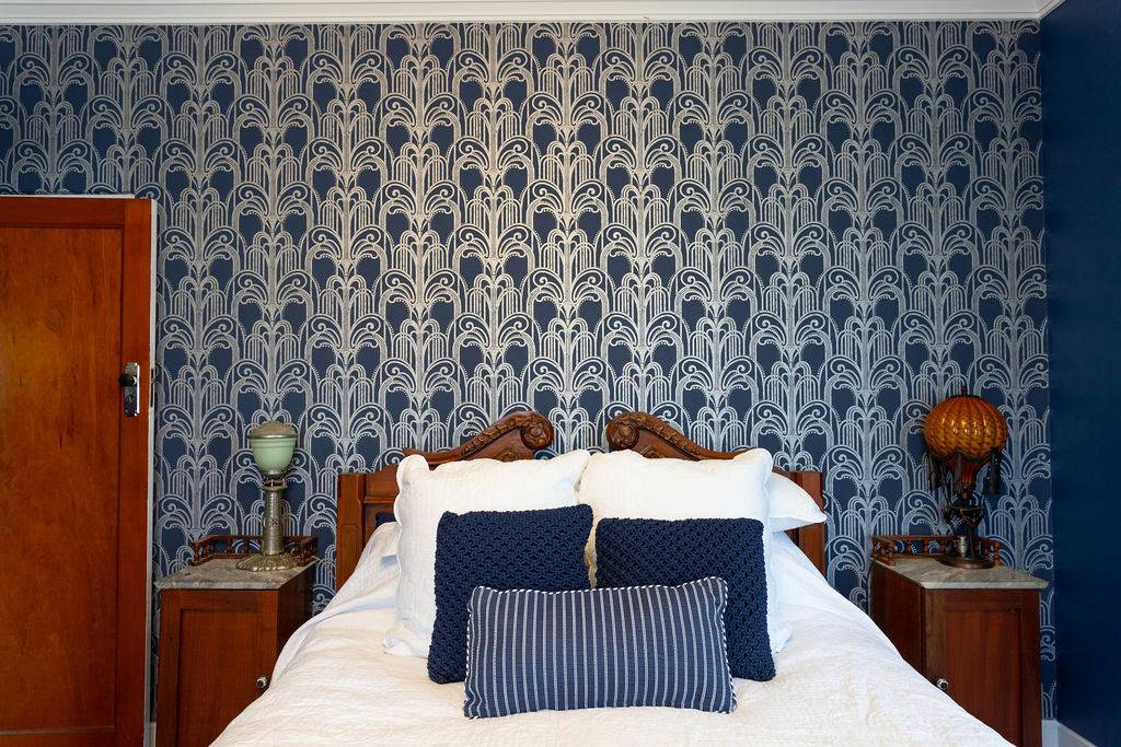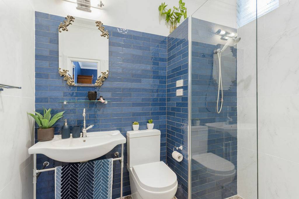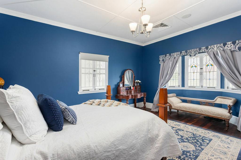 Stunning wall paper feature wall, in the main bedroom compliments the bay window with space for a chaise lounge. Tucked away a beautifully designed and tiled ensuite is a surprise and delight with gorgeous blue tiles and appointments.