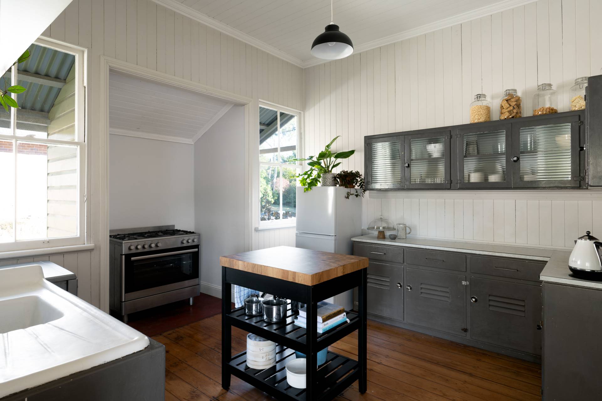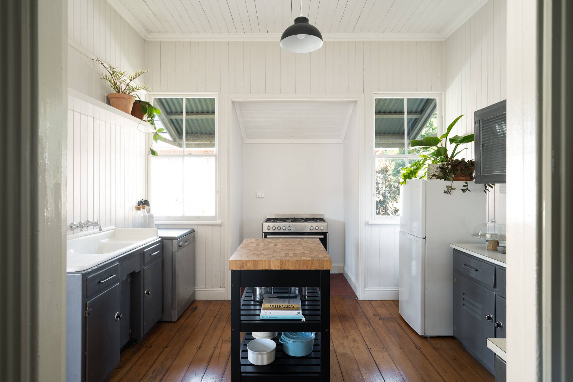 A very unusual design with a large central living room serviced by the kitchen and spilling out to the back verandah.