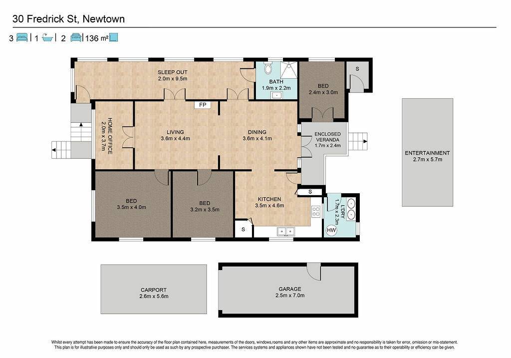 A large double living area is separated by a decorative timber arch, providing formal living and dining.  2 bedrooms off the living area are a good size.  A third smaller bedroom/office is located at the back of the home.  A large eat-in kitchen provides good storage and bench space.  The bathroom is located on the side verandah.