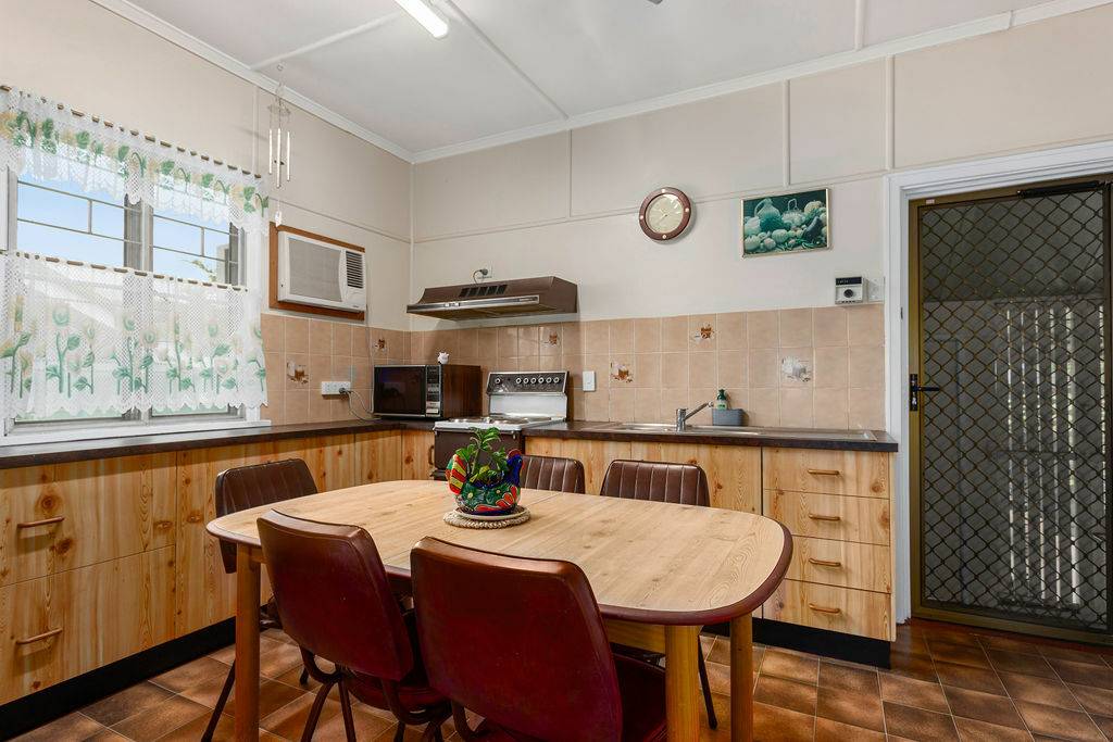 An eat-in kitchen has ample cupboard and bench space and is in top condition.