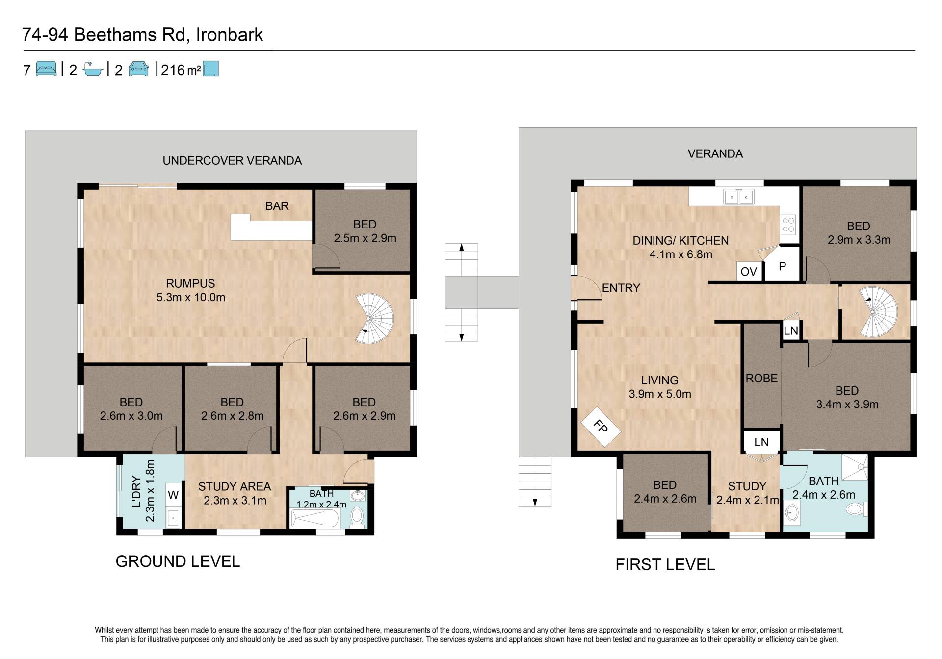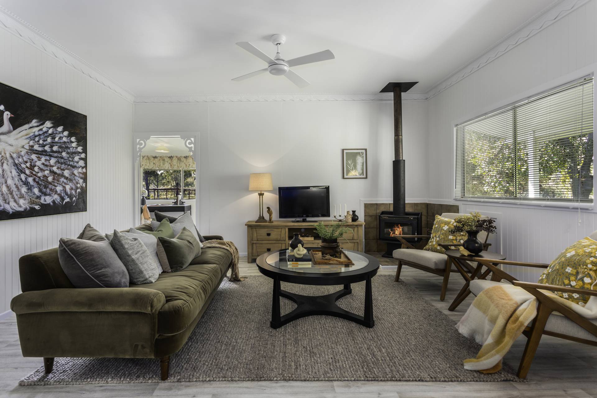 Large 2-Story Homestead with deep verandas and sweeping views from every window. Upstairs recently painted and new floor coverings installed is light and airy with large open living and a combustion fireplace in the corner so cozy for winter. 3 of the 7 bedrooms plus study are located on this level. This bathroom has two-way access to the main bedroom. An internal staircase connects to this lower level, opening to this large rumpus space ideal for a conference room for a home business.