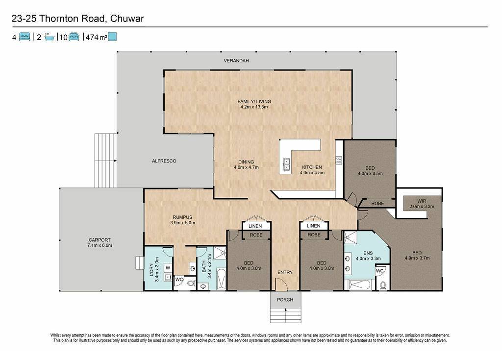 A second living space or gym is perfect for separate activities.  The main bedroom is huge and allows space for wheelchair access.  The ensuite has a large opening to also accommodate wheelchair access and there is a large walk in robe.  All the four bedrooms are built in and a cleverly designed main bathroom provides shower vanity and bath, plus separate powder room for guests and laundry with sliding door access to verandah.  There is an under-cover ramp access from the double car port.