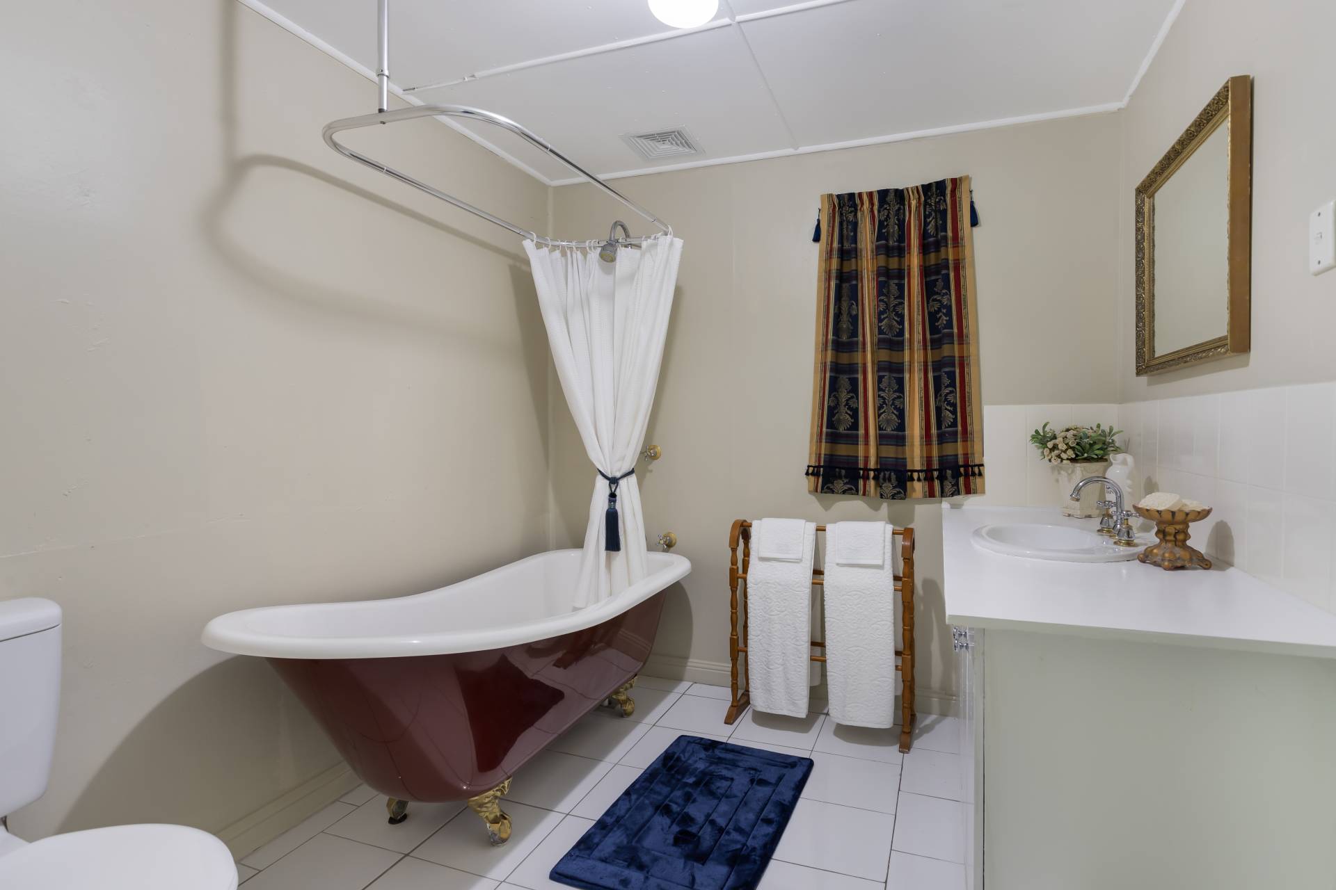 The beautiful bathroom has a free standing claw foot bath and a large vanity.