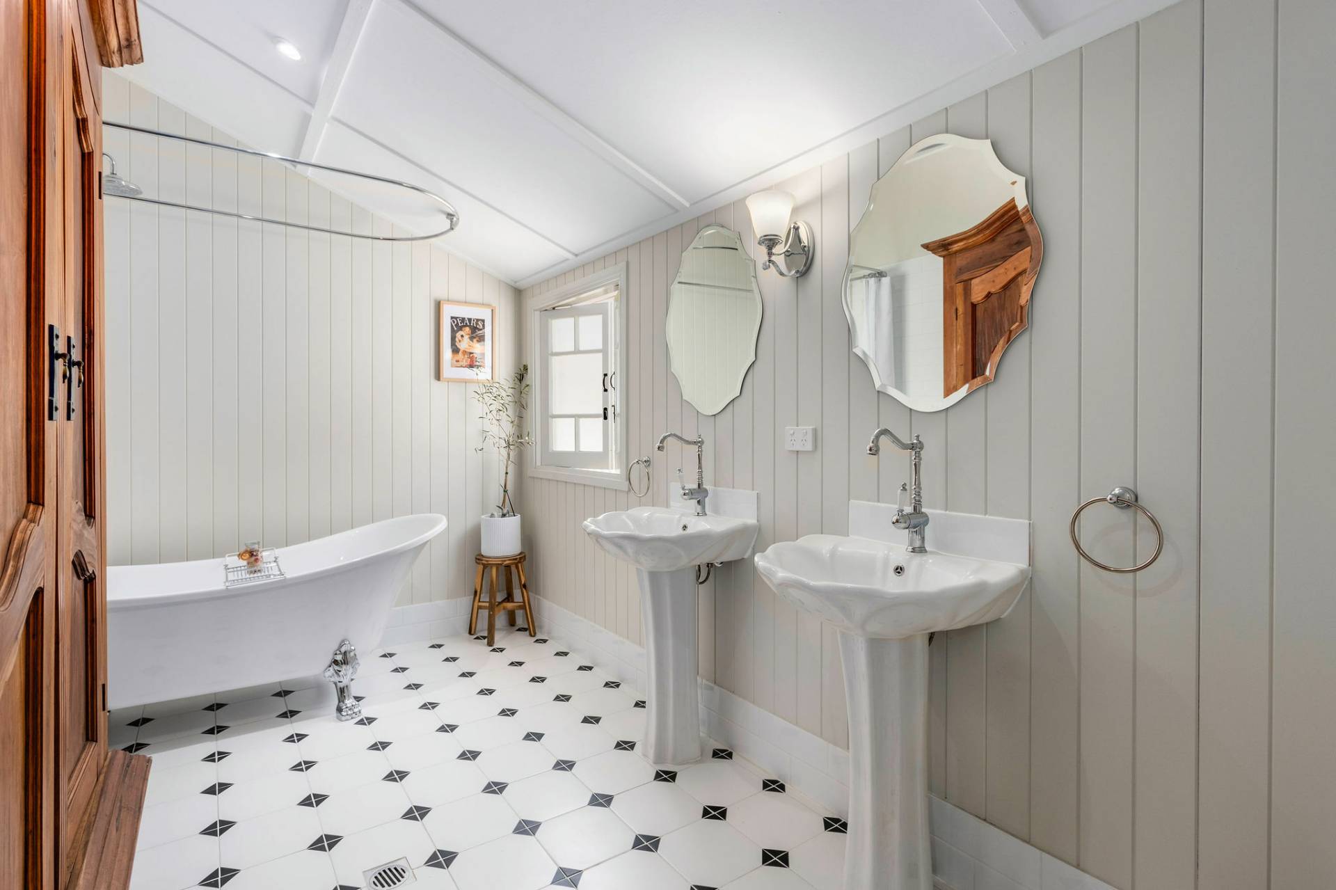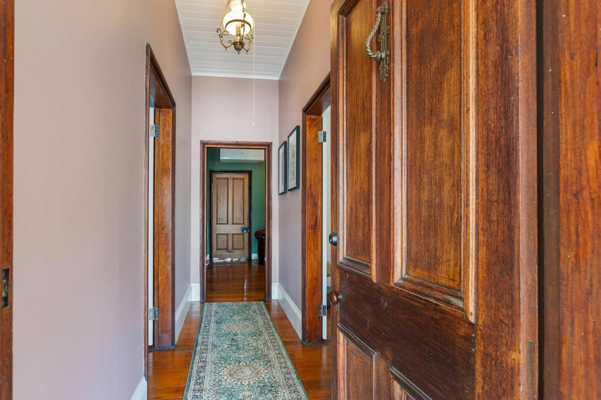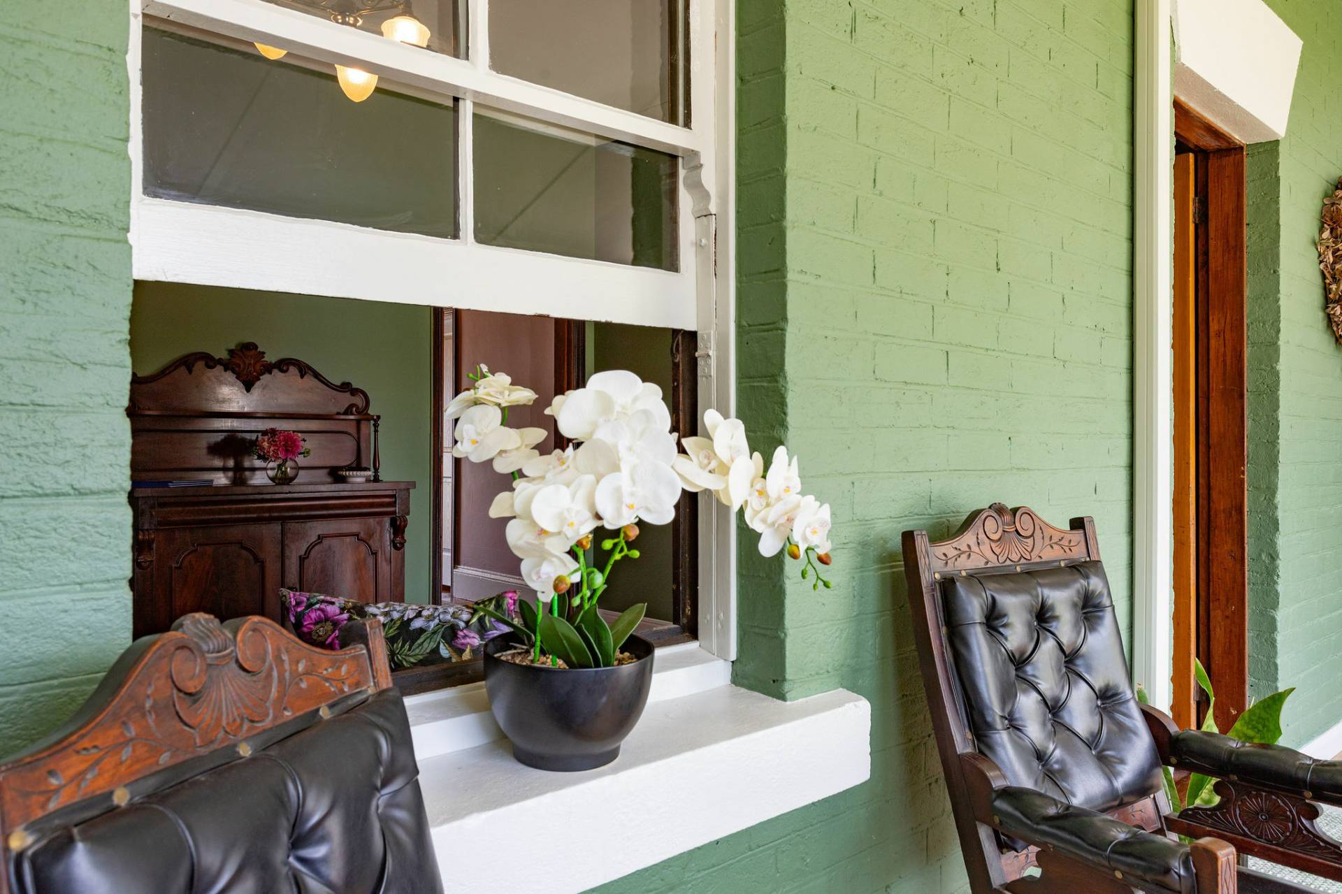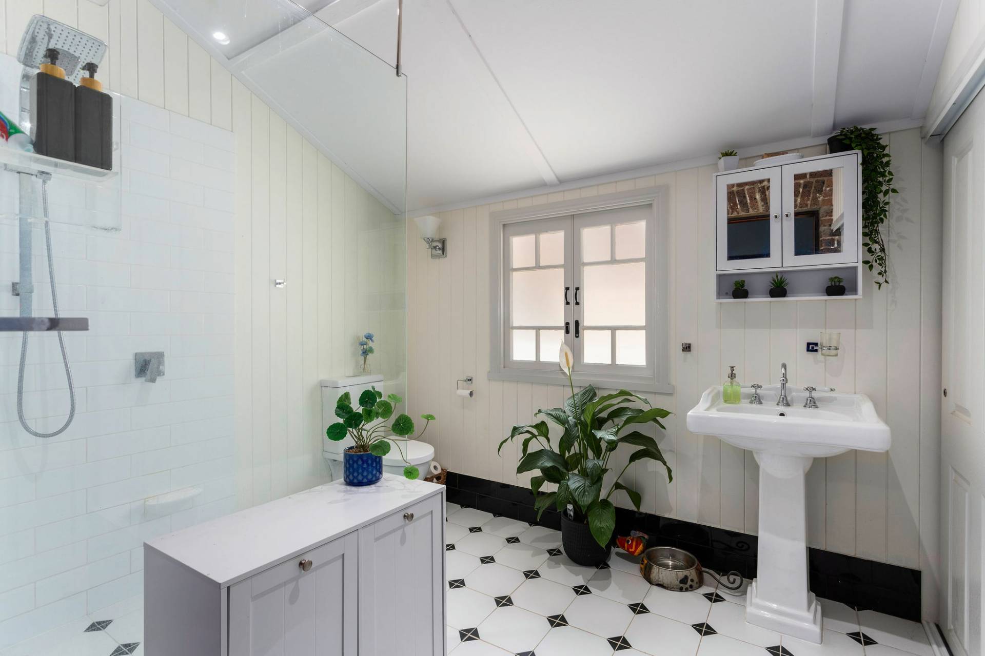 Wraparound living space is provided in the deep enclosed verandahs where you can enjoy the sunroom with a view to the CBD. A home office is also in this space and is tucked behind a privacy wall.  Separate W.C. has storage space, and a divine period bathroom features a stunning clawfoot bath, double his and hers shell pedestal basins, art deco mirrors and armoire for linen.