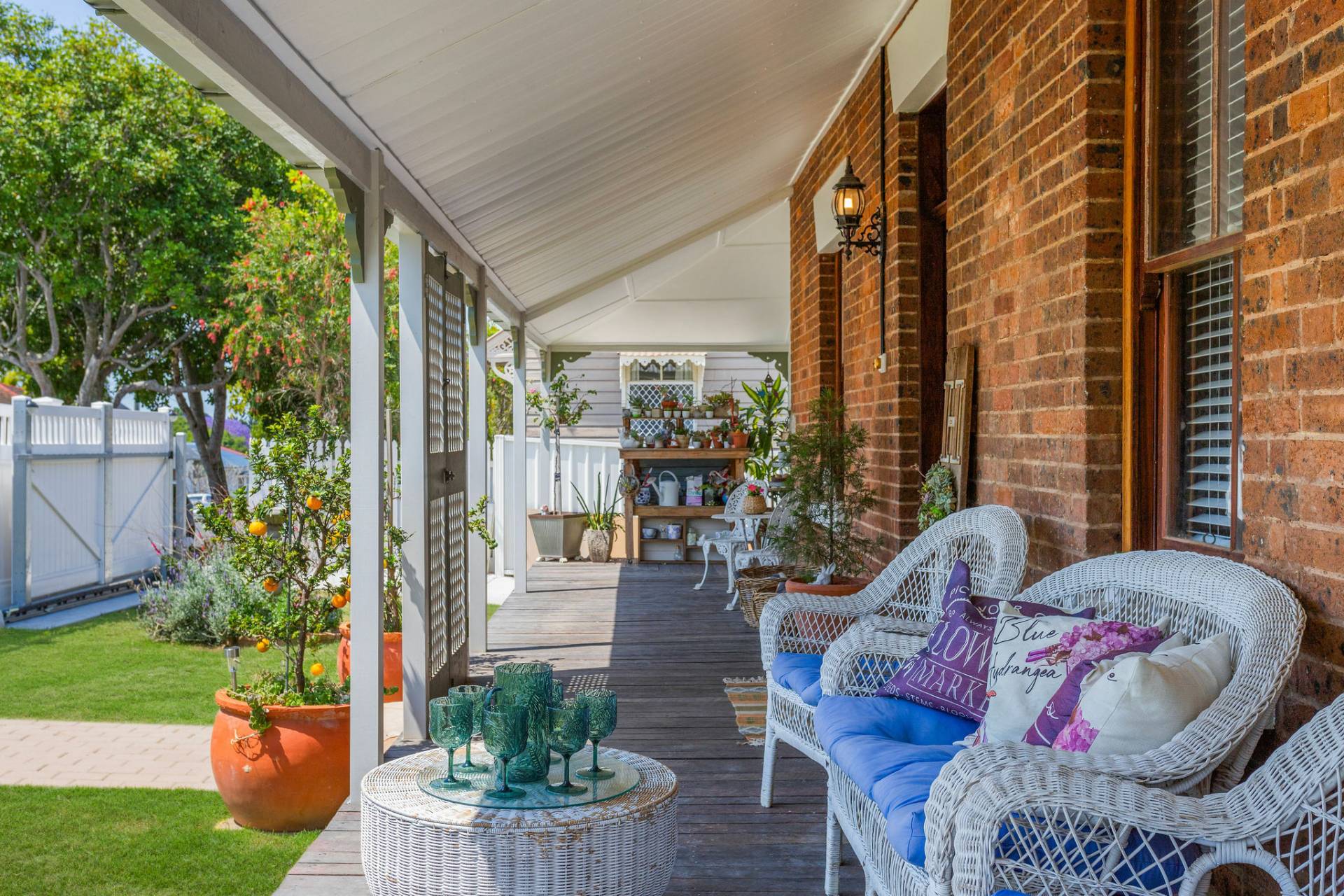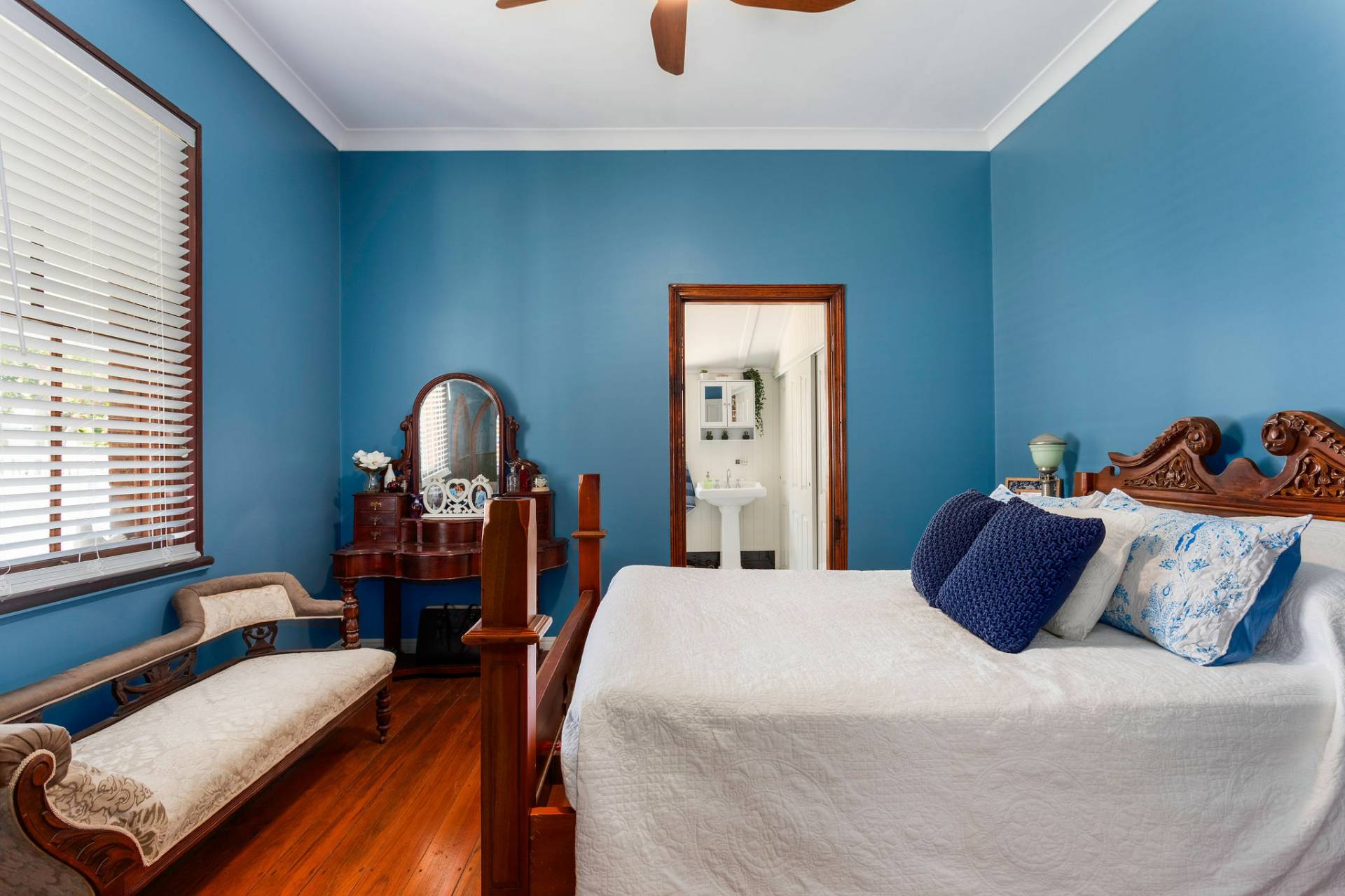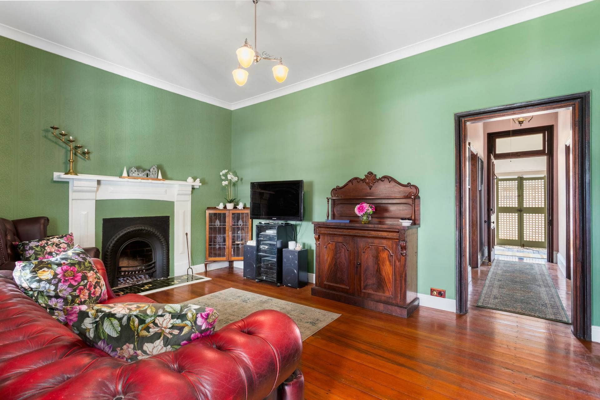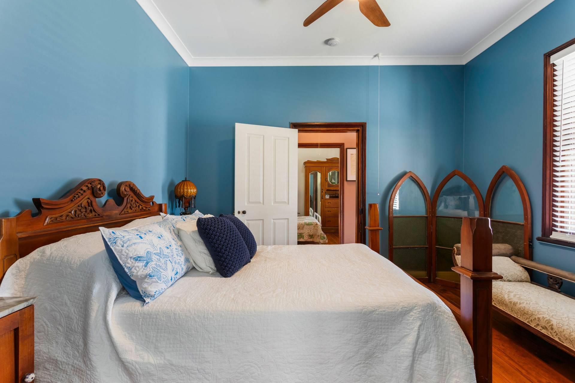 Wraparound living space is provided in the deep enclosed verandahs where you can enjoy the sunroom with a view to the CBD. A home office is also in this space and is tucked behind a privacy wall.  Separate W.C. has storage space, and a divine period bathroom features a stunning clawfoot bath, double his and hers shell pedestal basins, art deco mirrors and armoire for linen.