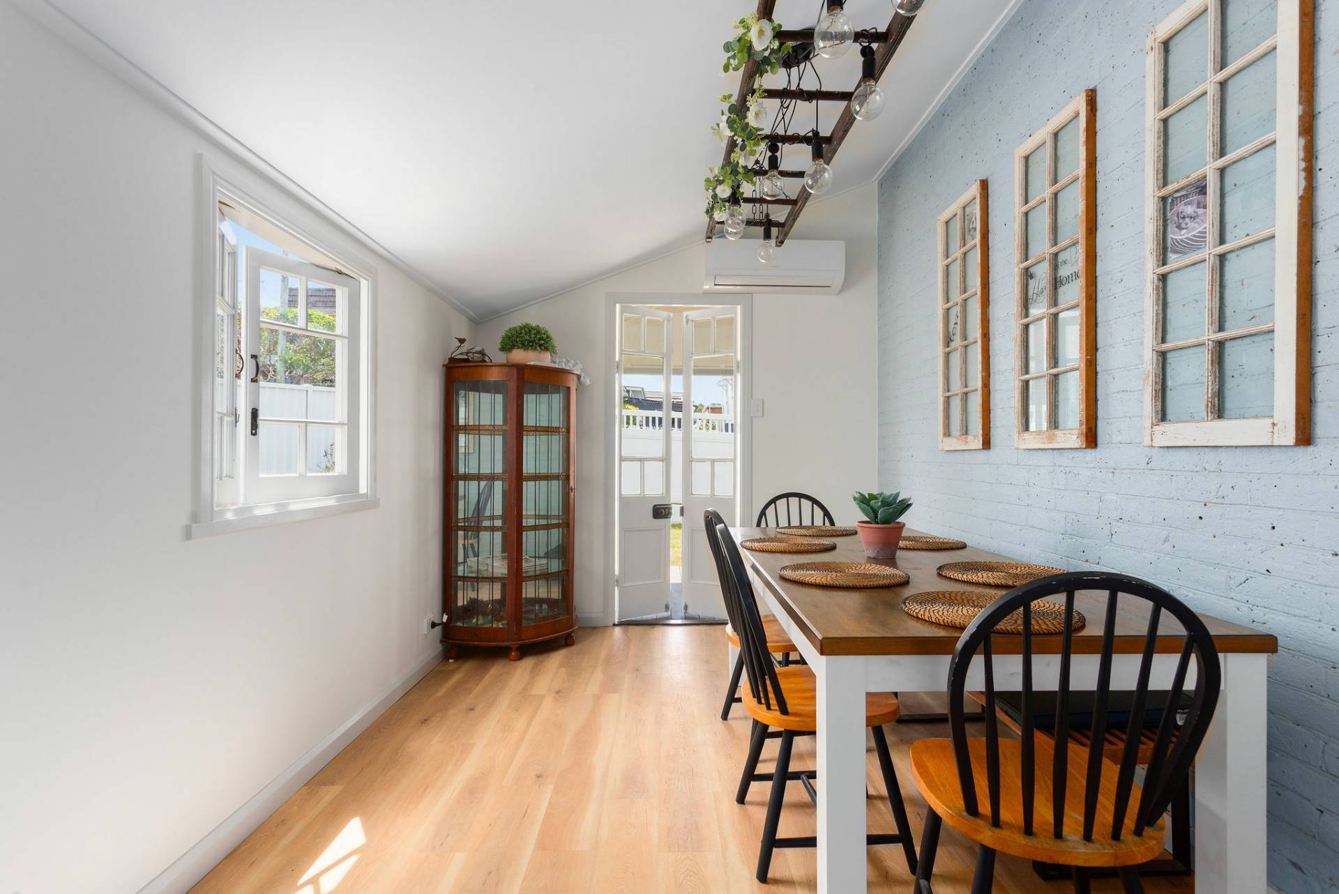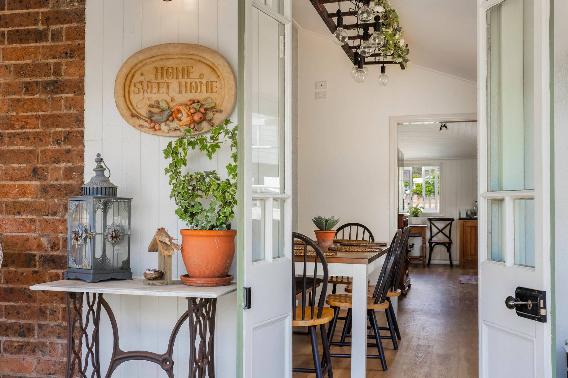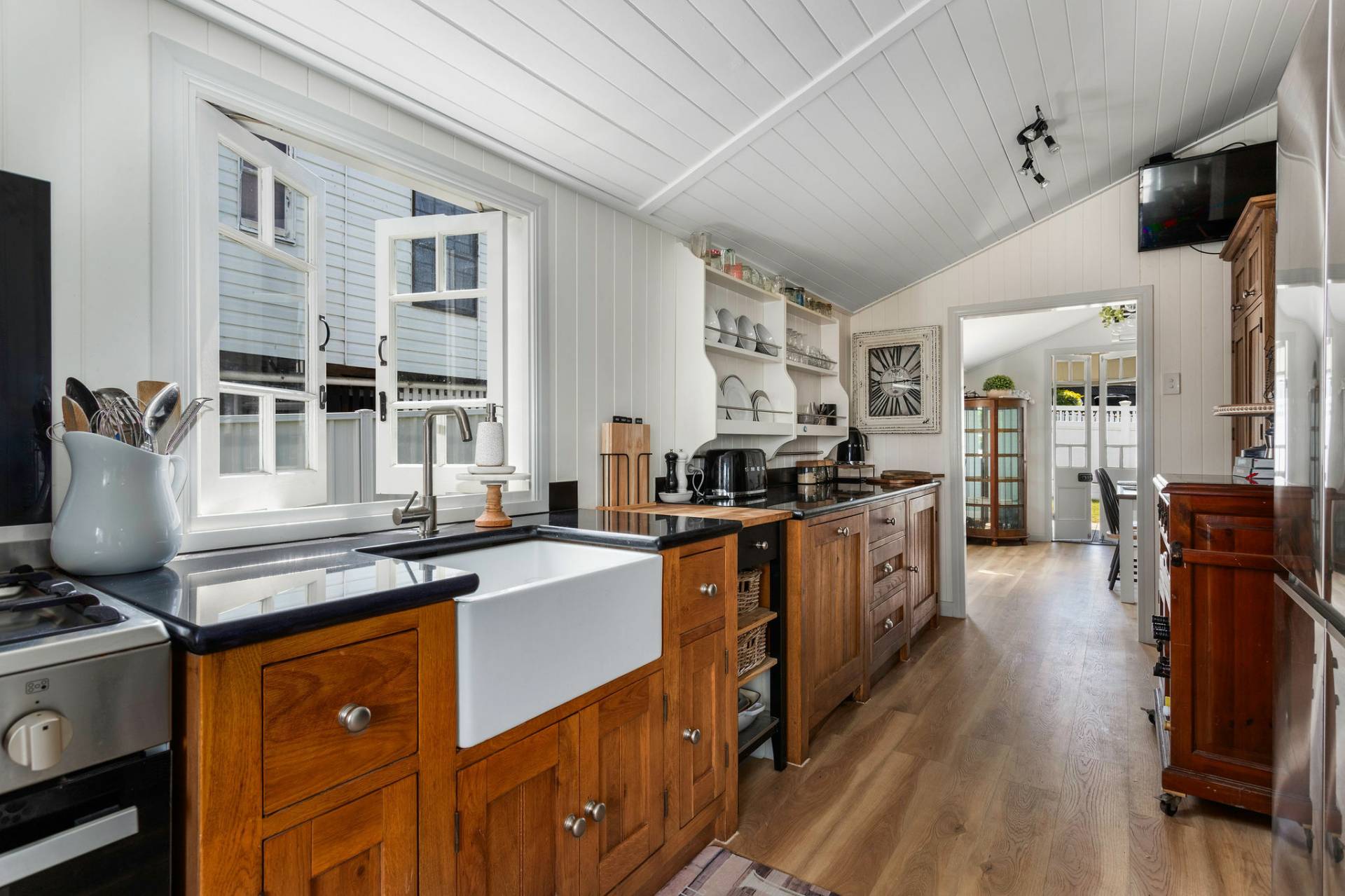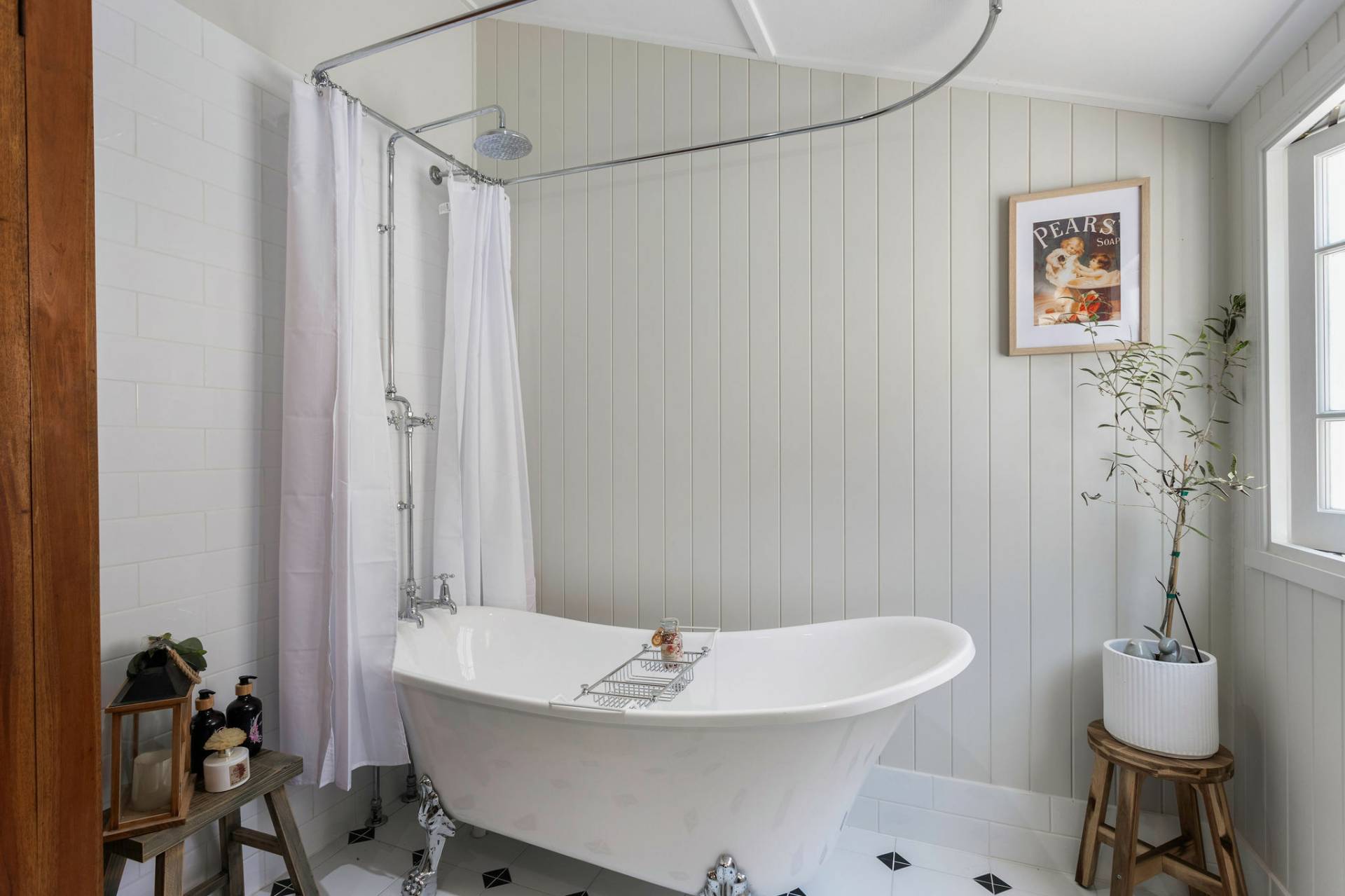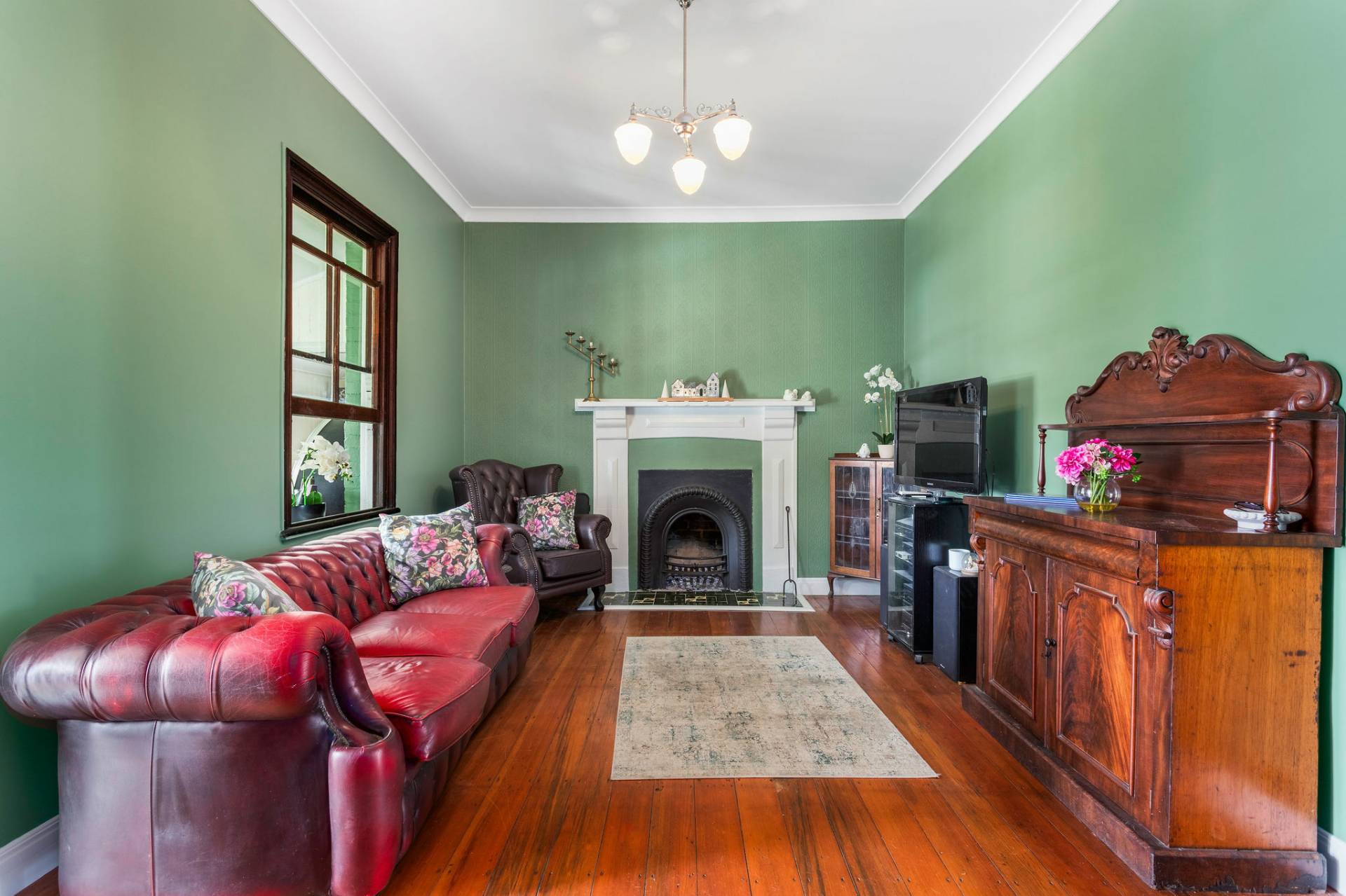 Wraparound living space is provided in the deep enclosed verandahs where you can enjoy the sunroom with a view to the CBD. A home office is also in this space and is tucked behind a privacy wall.  Separate W.C. has storage space, and a divine period bathroom features a stunning clawfoot bath, double his and hers shell pedestal basins, art deco mirrors and armoire for linen.