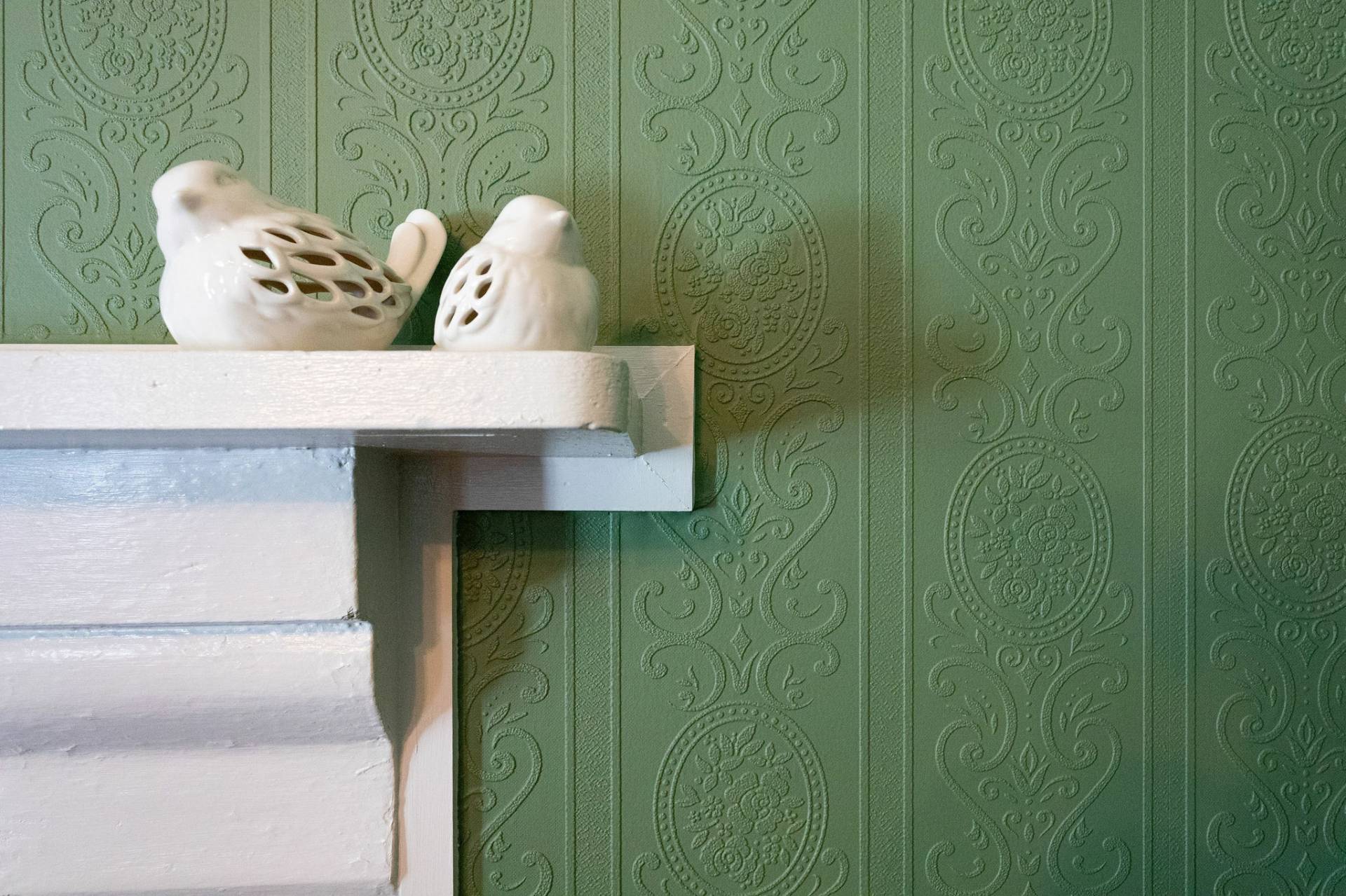 Embossed feature wallpaper and stunning working fireplace enhance the charm of the formal living area.