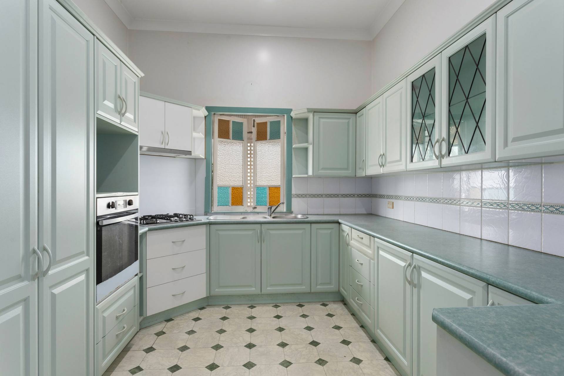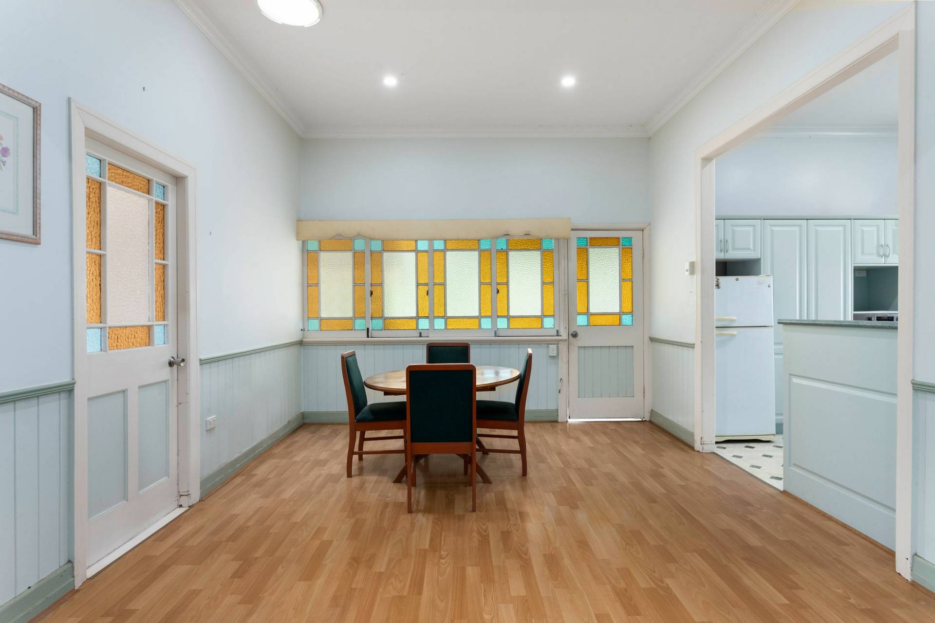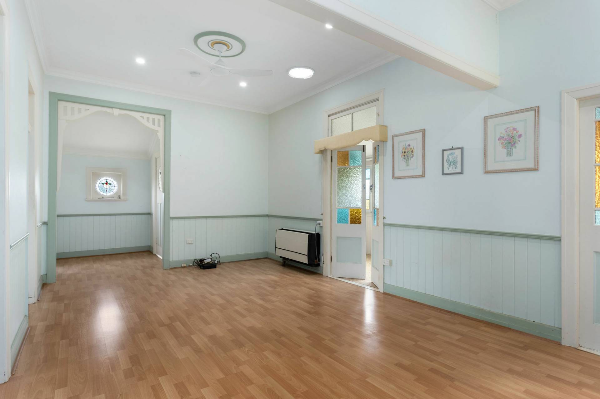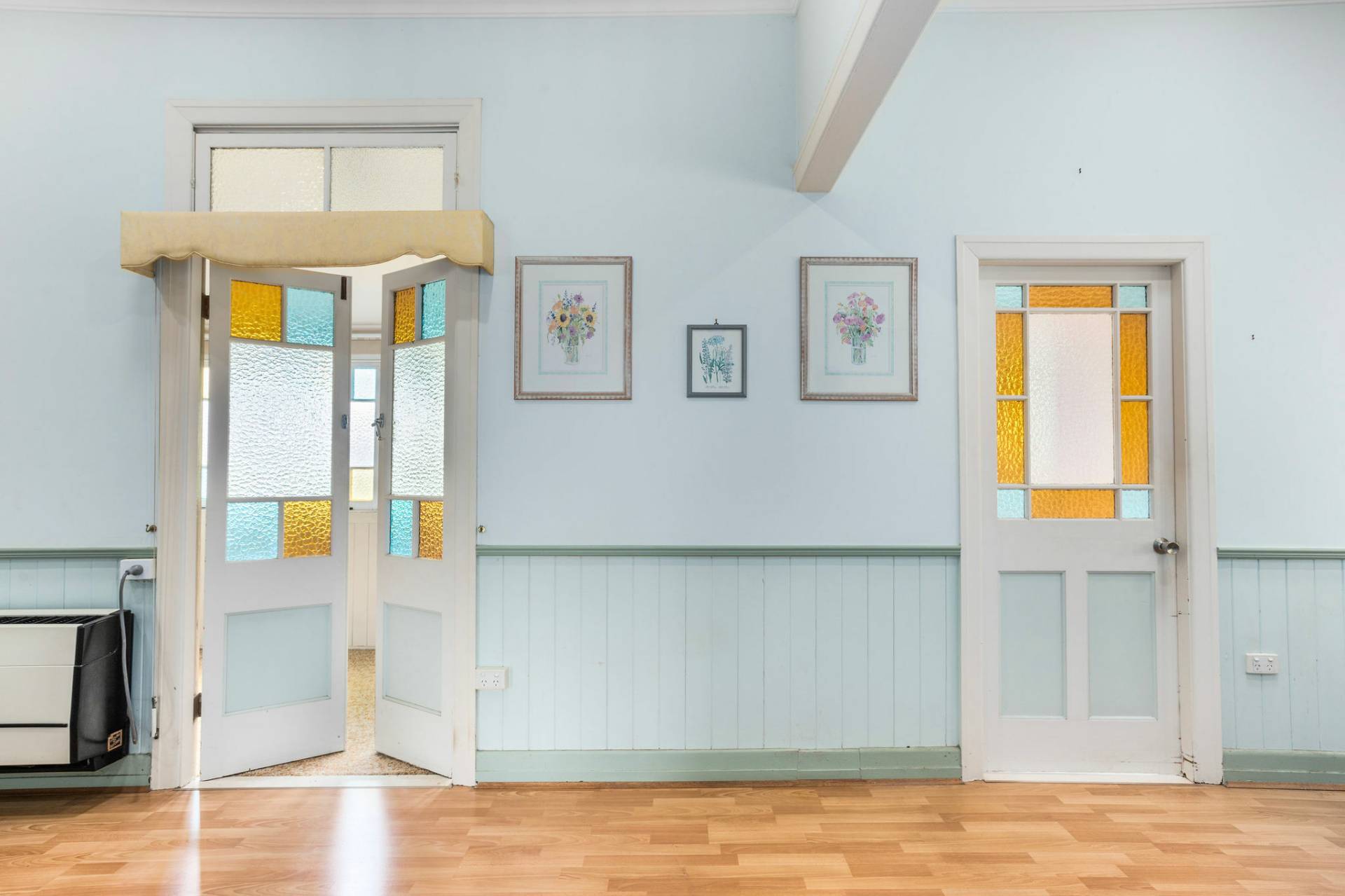 Many original features include timber fret work and an abundance of coloured glass windows. Very generous living space and the kitchen is well appointed with loads of cupboards and bench space.