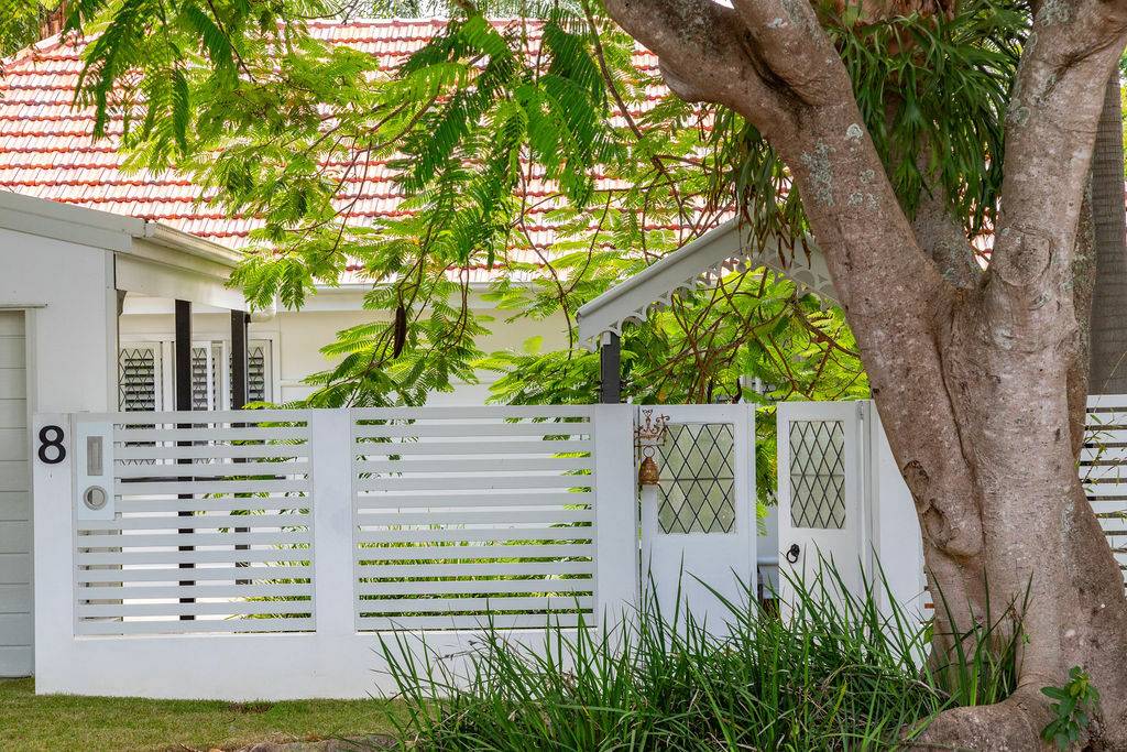 A mature Poinciana frames the street scape and is striking contrast to the terracotta tiled roof, fully restored.
