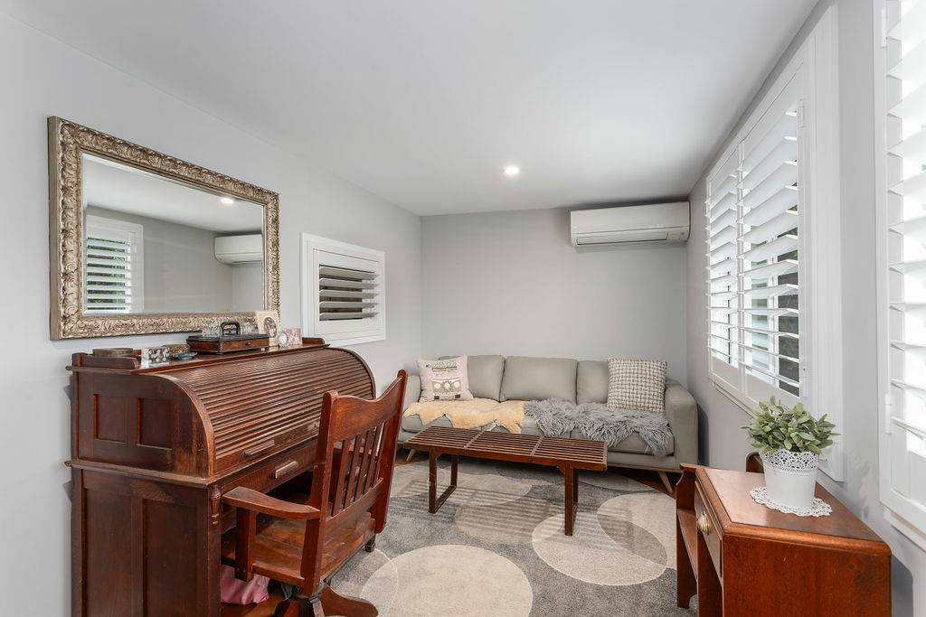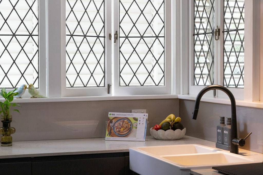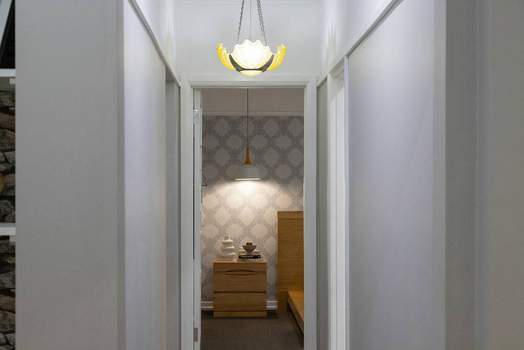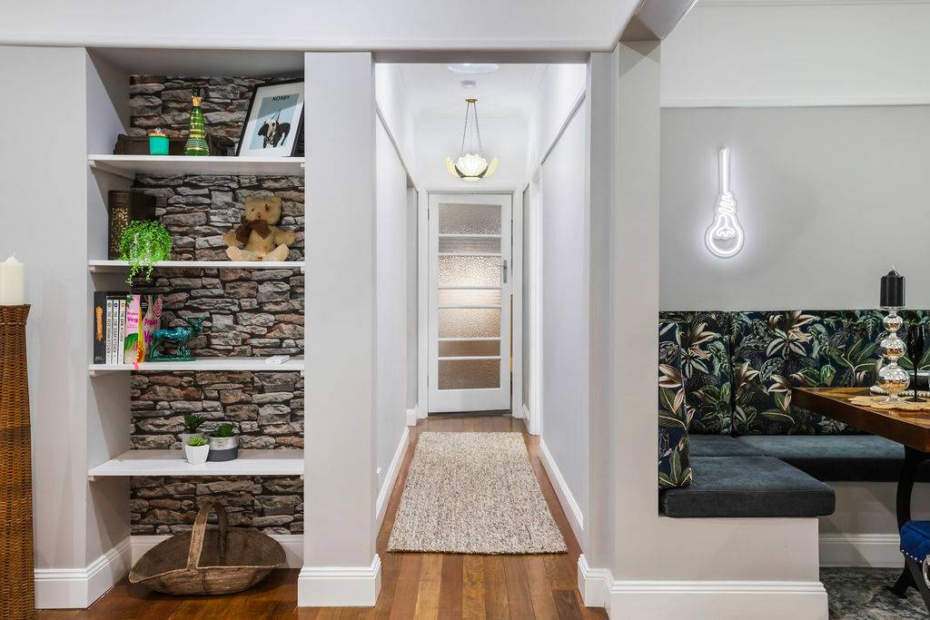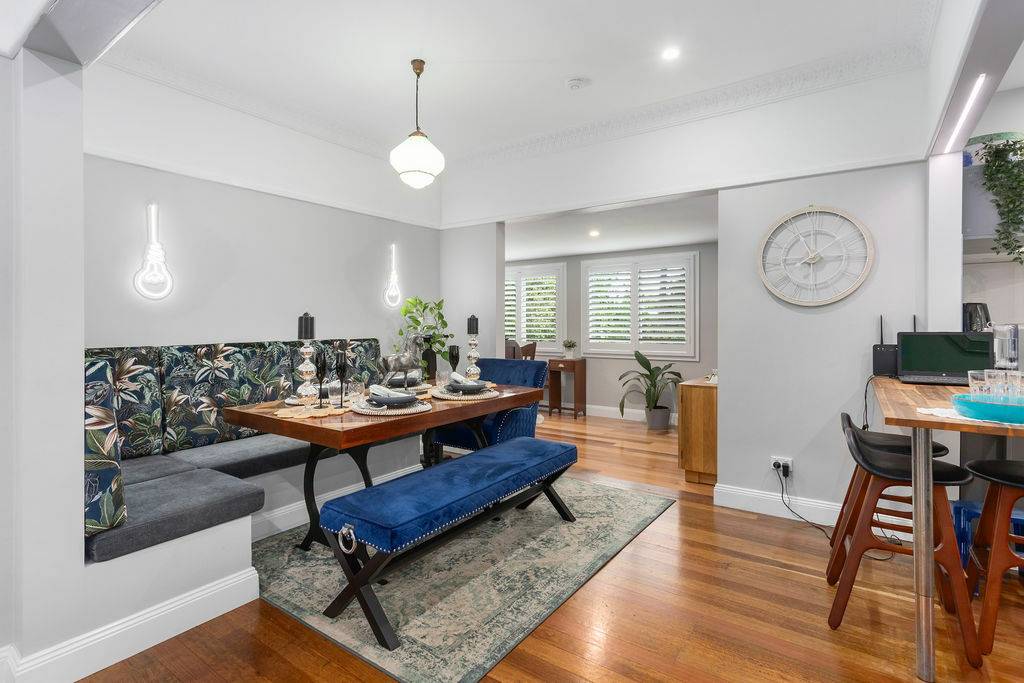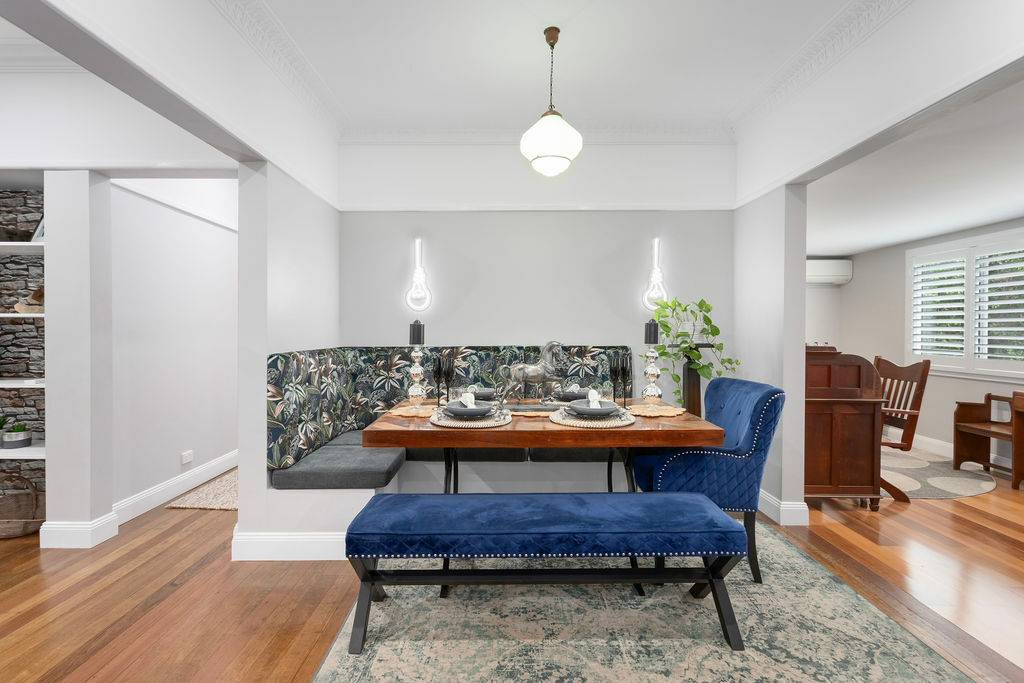 The original brick patio leads to the front door, opening to the luxurious open plan living to include formal lounge flowing to dining with upholstered corner seating, funky wall lights and tied together with original green art deco light fitting.  Such a hub for any family with a well-appointed kitchen with butlers sink, abundant storage and bench space, topped off with a breakfast bar for a casual lunch or breakfast.