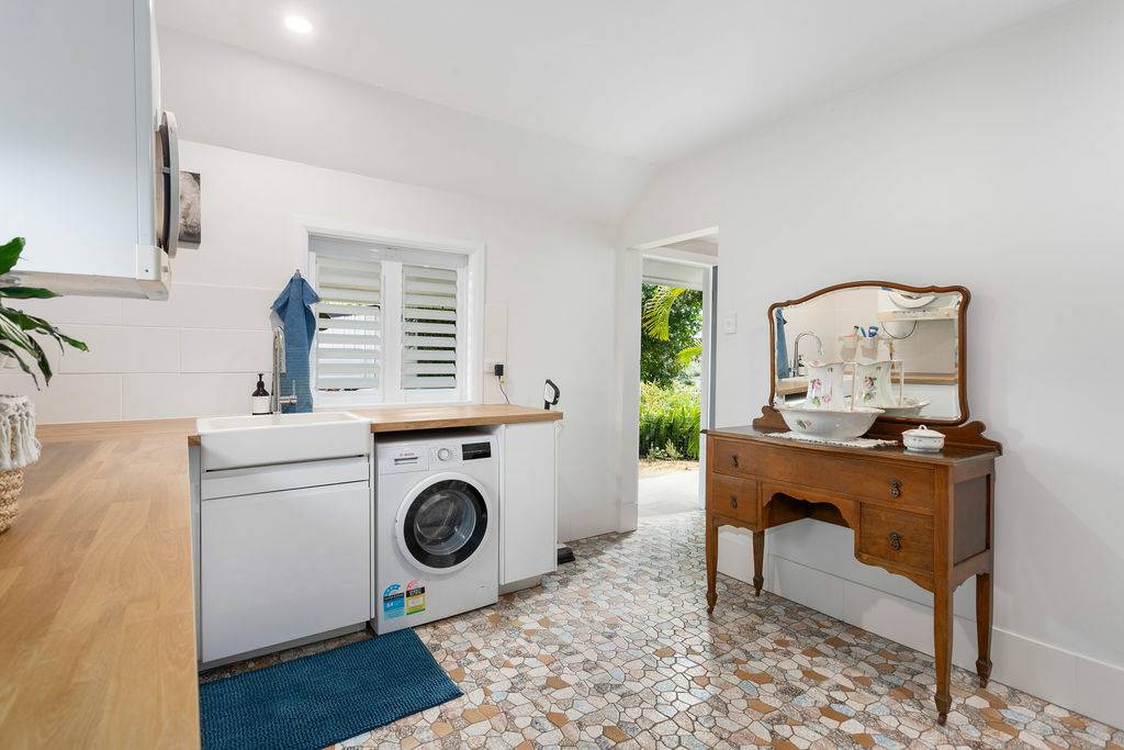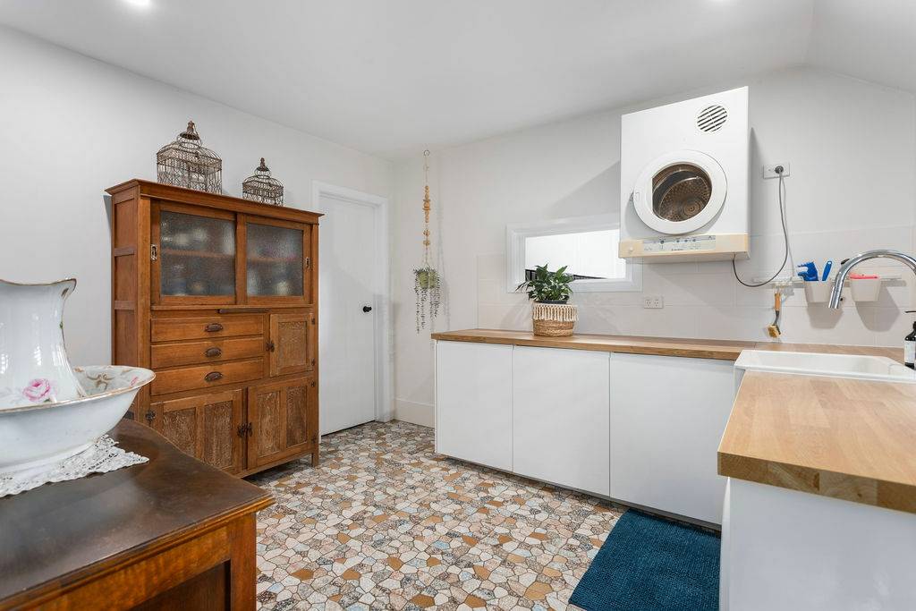 Take a walk down a few stairs to an oversize laundry with original mosaic tiles, doubling as a kitchen space to service the new entertainment area.  This space also serviced by a third water closet, so convenient, and overlooks the private fully fenced lawn area bound by a mature garden – room for a pool.