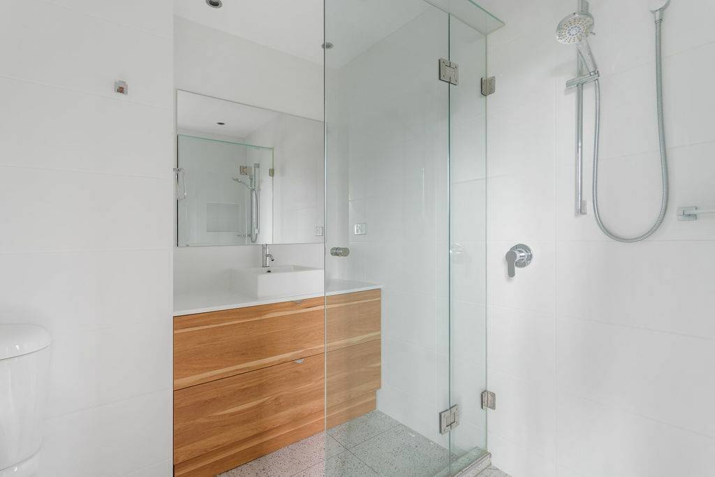 Impressive Bathroom with floor to ceiling tiles large vanity and frame less shower