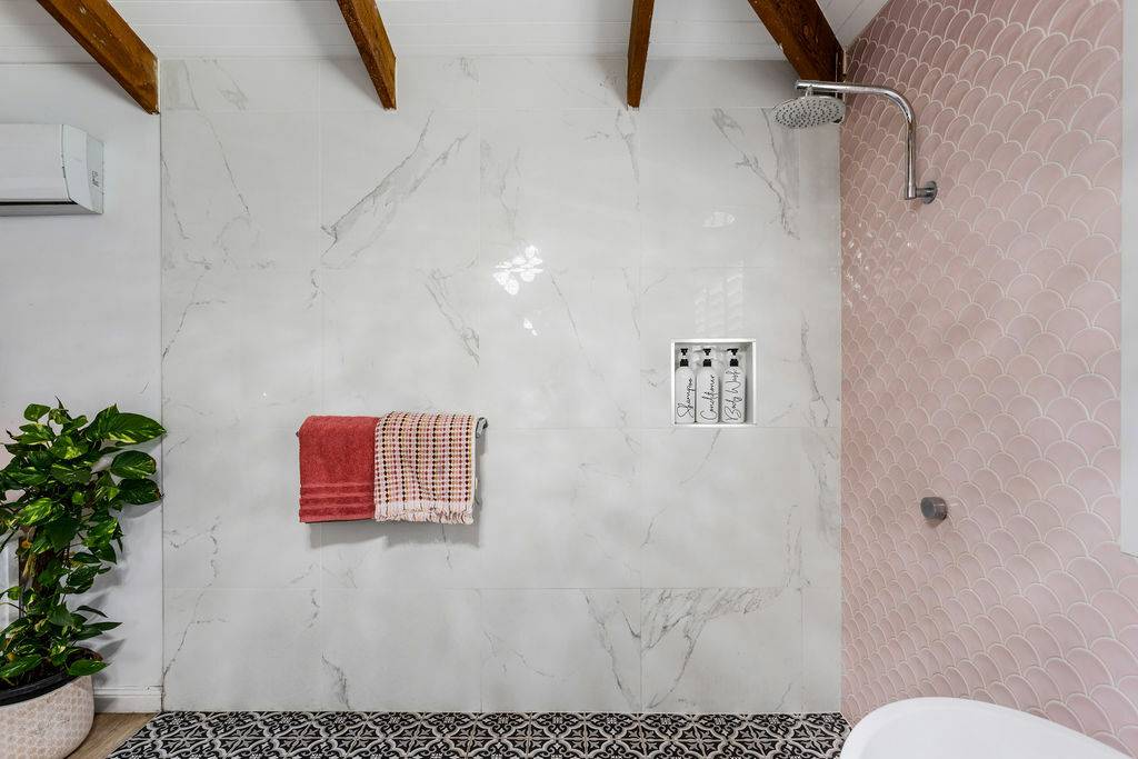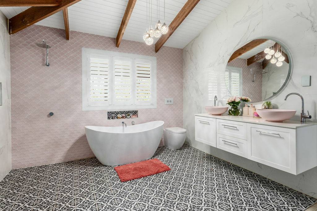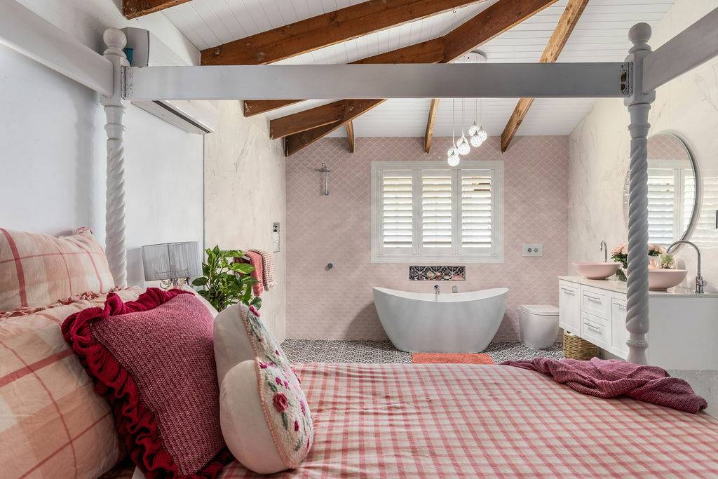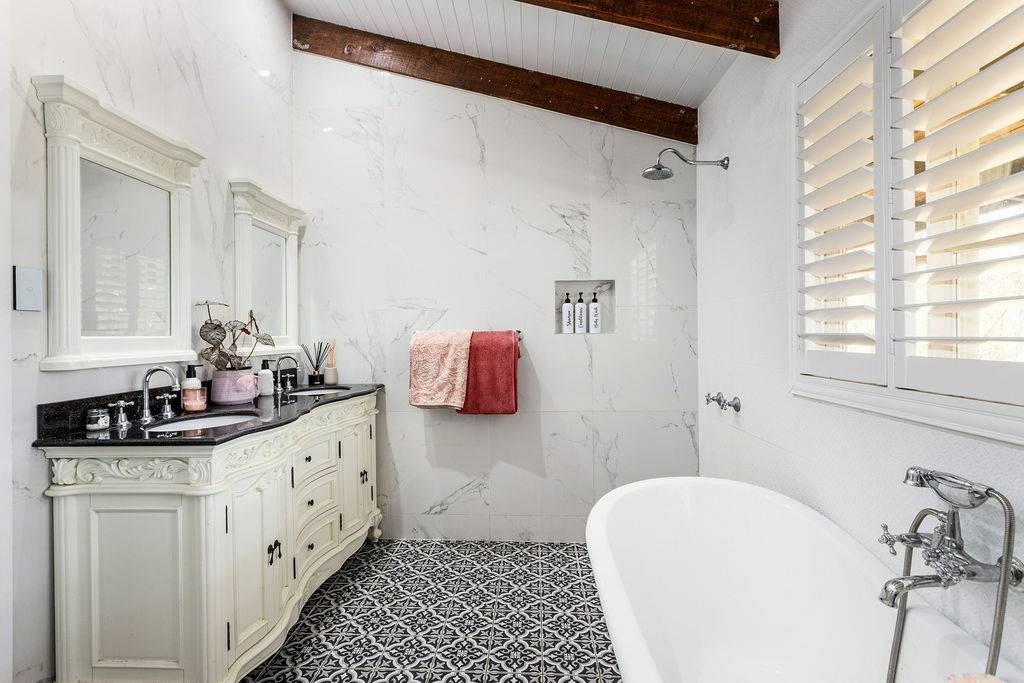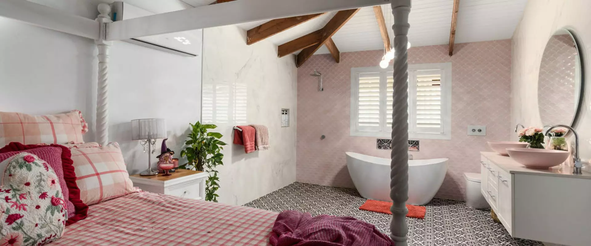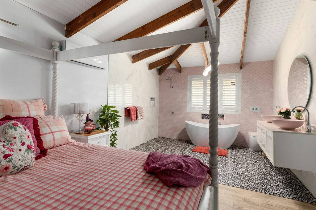 Originally a four-bedroom layout, the current owners have combined the 3rd and 4th bedrooms to create a luxurious master suite. The open ensuite features beautiful fish scale tiles, a free-standing bath, and an open shower — an absolute WOW Factor. The main bathroom is equally impressive with a pink claw-foot bath and high-end finishes.