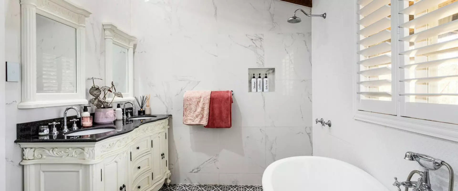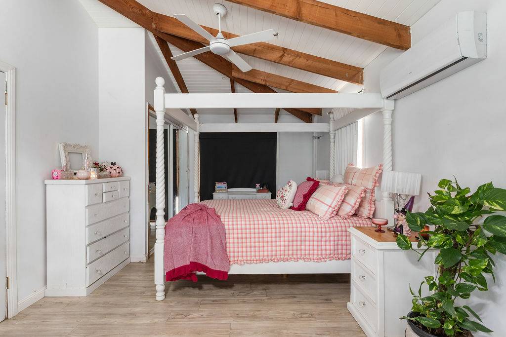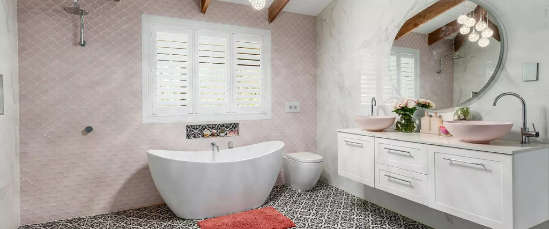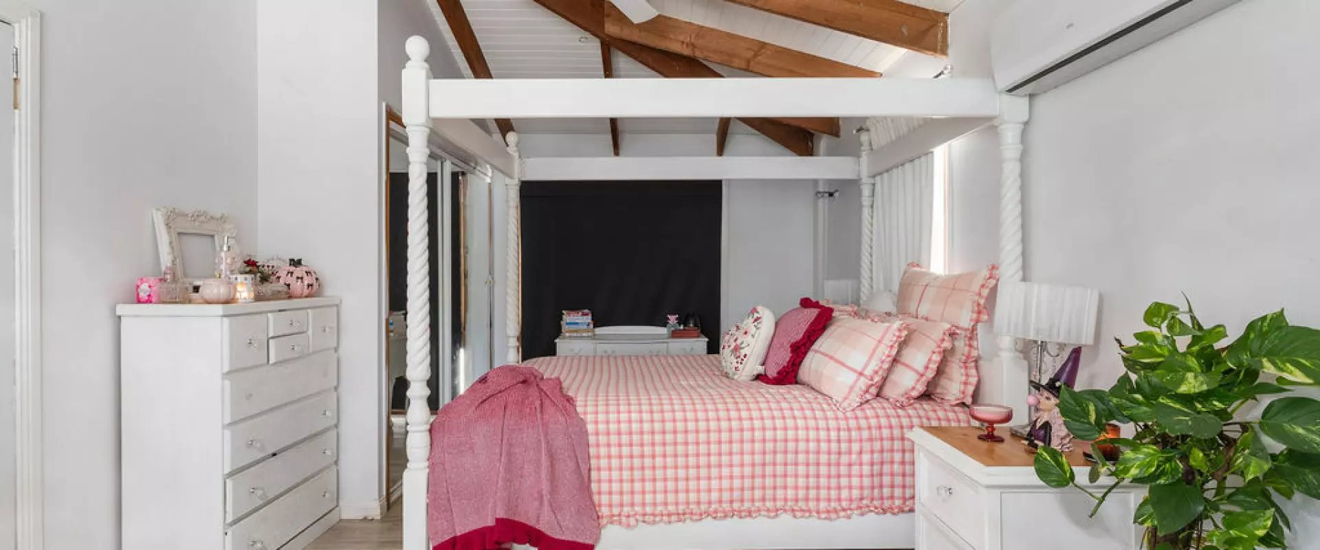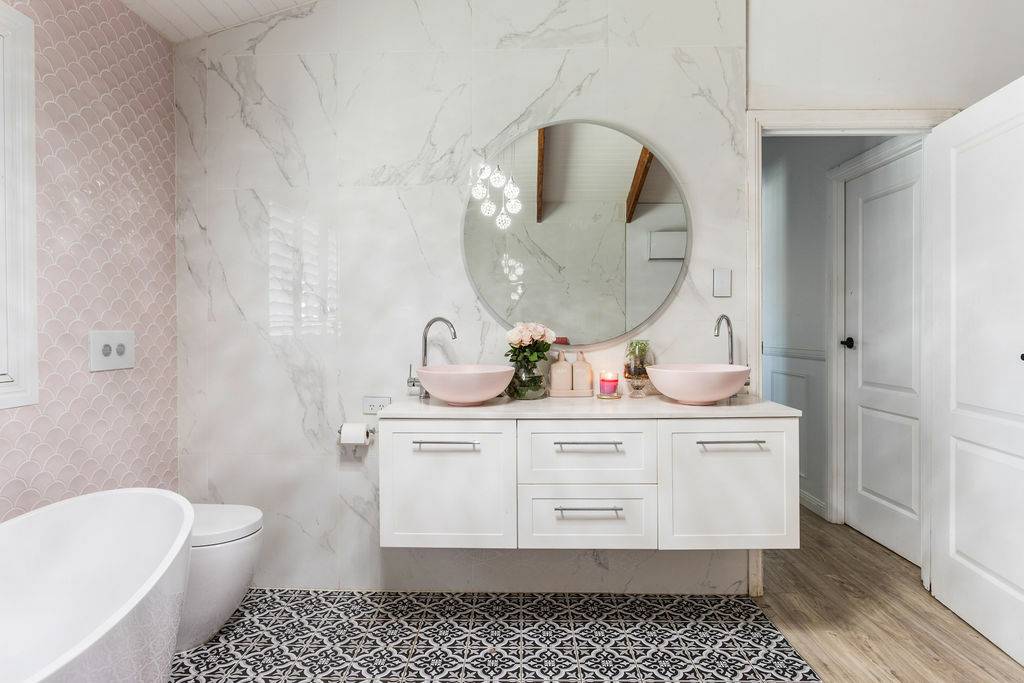 Originally a four-bedroom layout, the current owners have combined the 3rd and 4th bedrooms to create a luxurious master suite. The open ensuite features beautiful fish scale tiles, a free-standing bath, and an open shower — an absolute WOW Factor. The main bathroom is equally impressive with a pink claw-foot bath and high-end finishes.