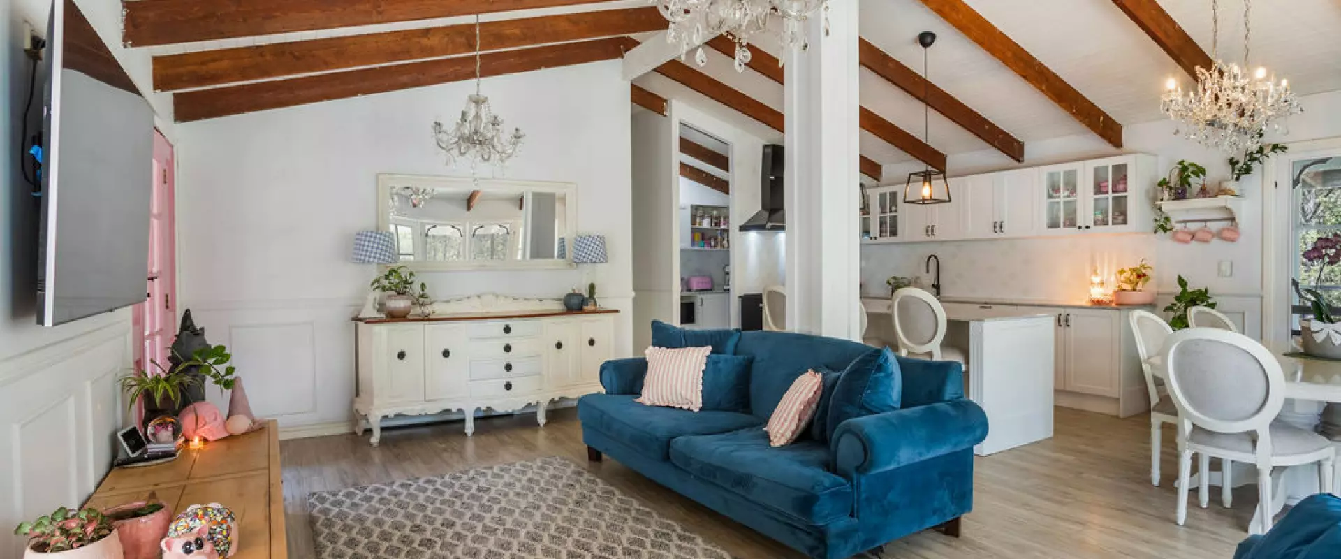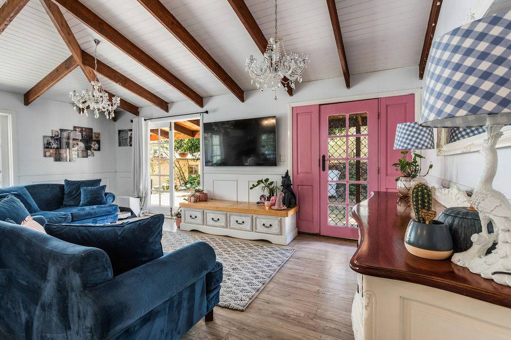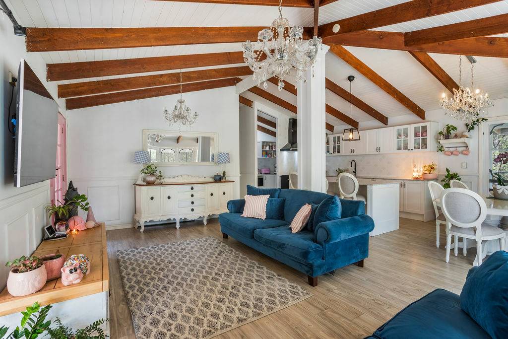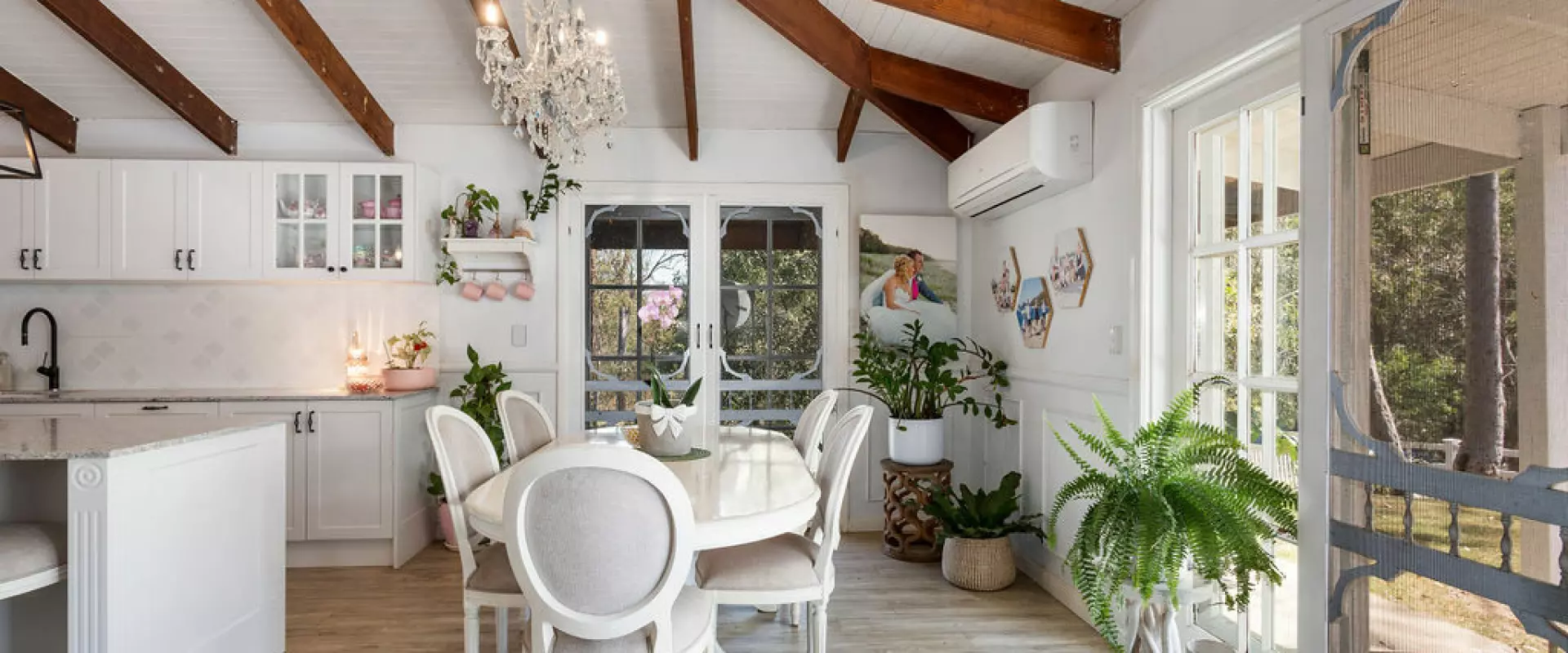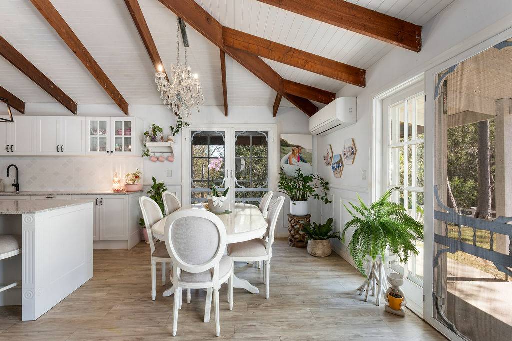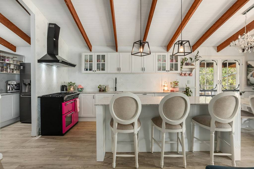 Originally built as a rustic Western Red Cedar cabin, the home has undergone a sophisticated transformation. The exterior has been upgraded with chamfer boards, while the interior has been completely relined and features charming dado rails. The high, raked ceilings with exposed beams preserve the original cabin character.
