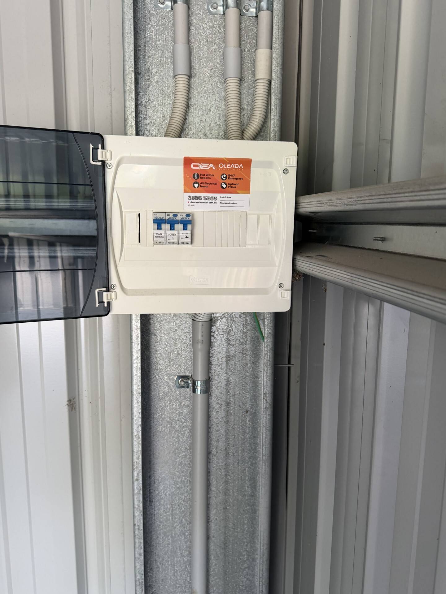 A powered shed with automatic door and workshop space, ideal for the home handyman