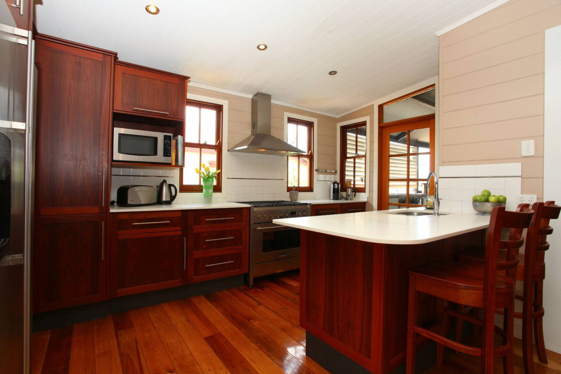 Wow! What a stand out in design, lifestyle and space. Originally built in 1910 the solid, Woodend colonial has had a recent transformation to compliment the quintessential colonial features including horizontal internal walls inside honey coloured floors and wrap around verandahs while adding a unique semi circular deck, accessed from open plan living through bi folds to give maximum light and space. Cooking is a delight in the timber kitchen with ceasear stone bench tops & huge gas stove adjoining eastern verandah with built in bbq. Ideal for summer meals and gatherings. The top rail on the verandah has been cleverly designed to allow drinks to rest comfortably around beer or wine o’clock. An extension at the rear has provided space for the main bedroom with a full length walk through robe and ensuite.