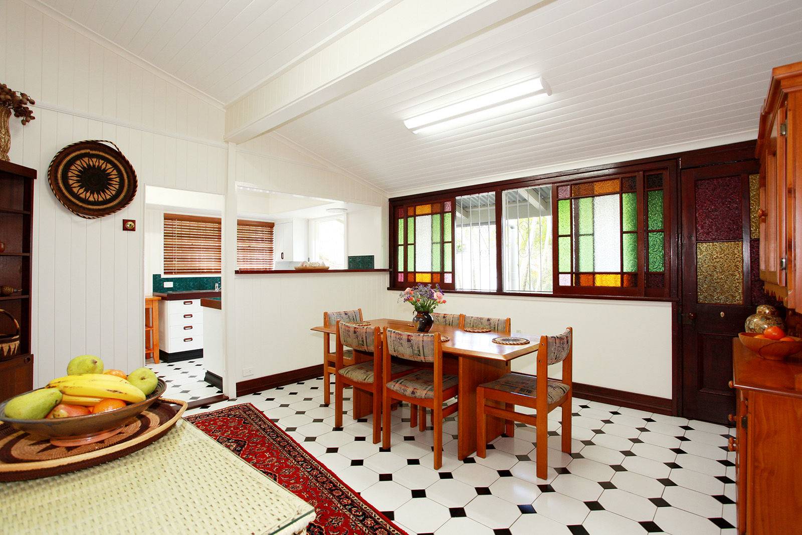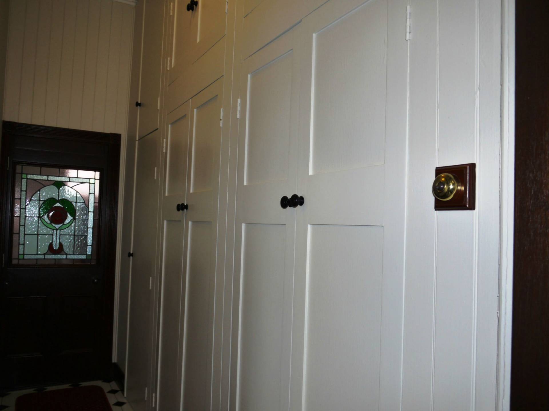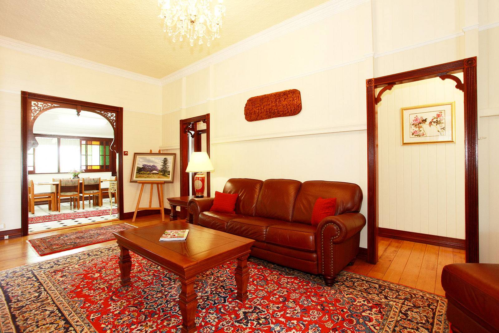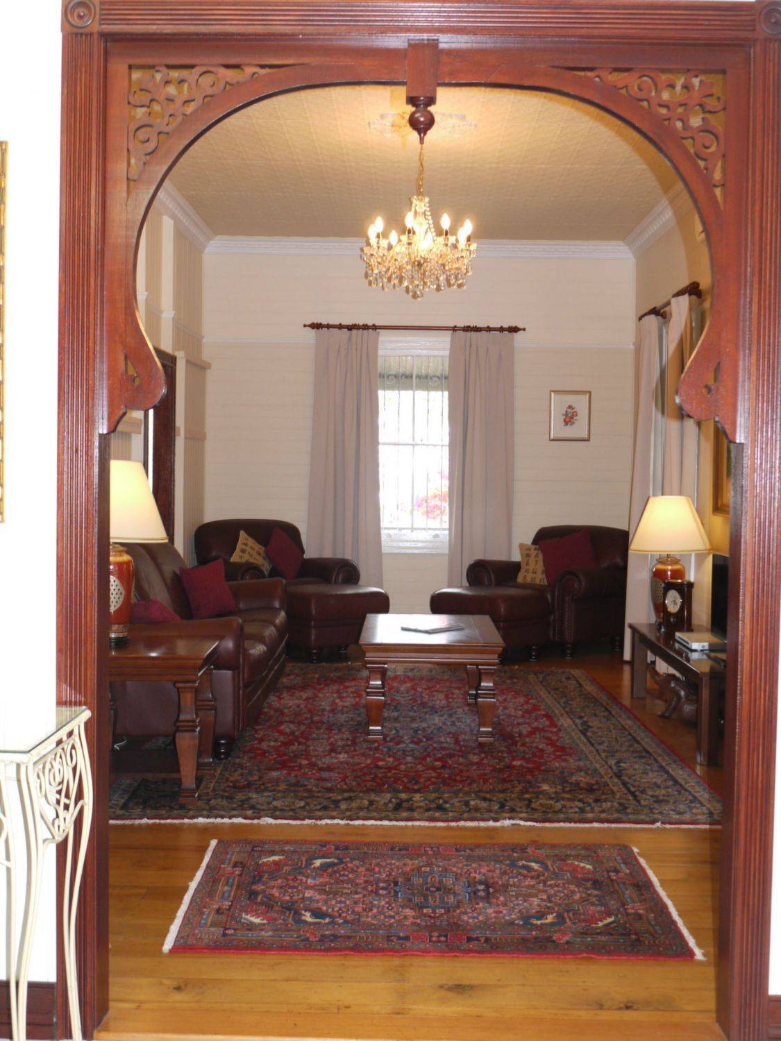 An impressive chandelier highlights the pressed metal ceiling in the formal lounge and is separated by a decorative timber arch to formal dining featuring Jap floral coloured glass windows. A wall of storage cupboards leads to third bedroom with new Westminster carpet and through a leadlight featured door to renovated bathroom.