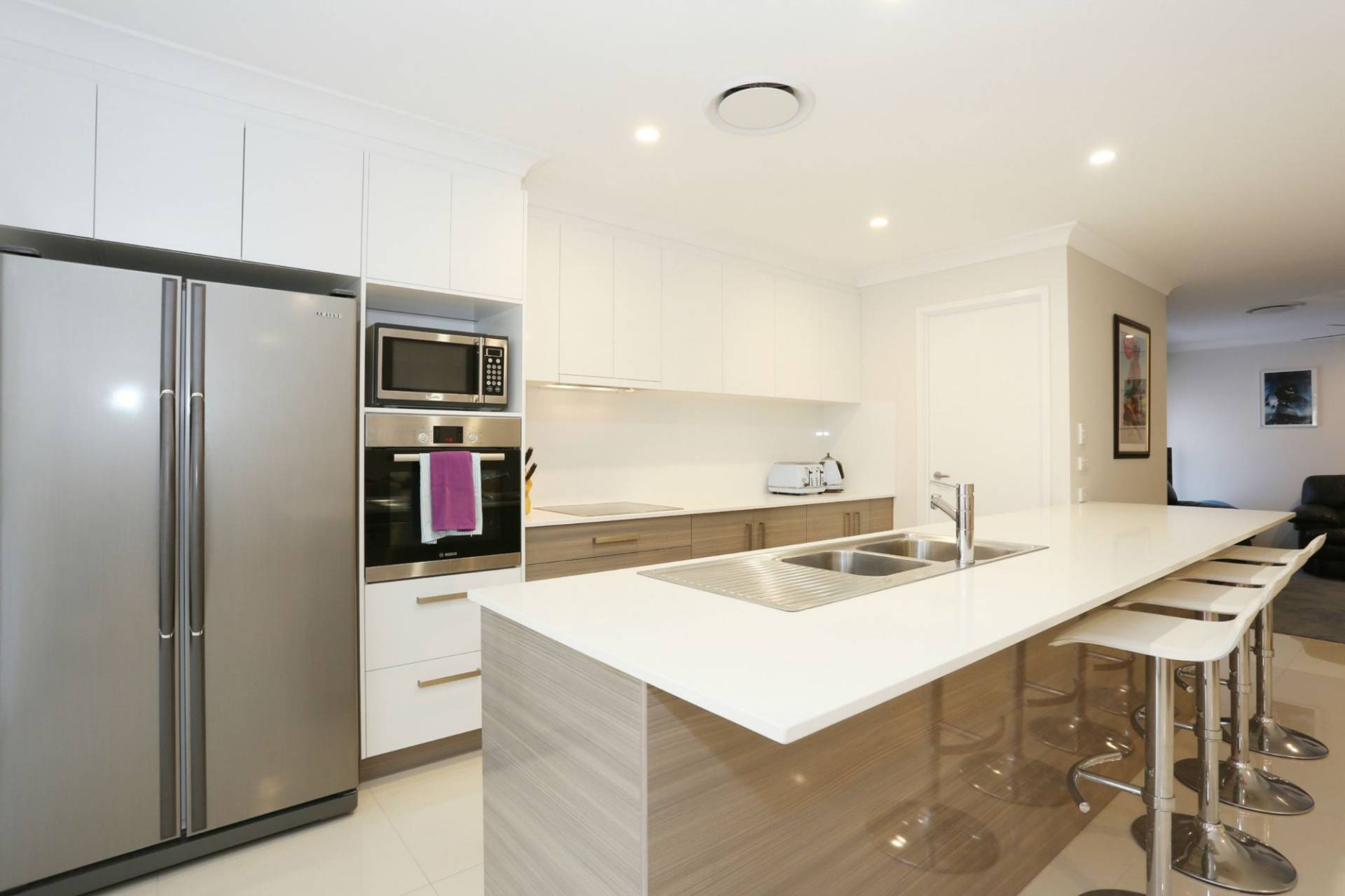 - Kitchen is the ultimate in modern luxury with sleek handless overhead cupboards, Caesarstone bench tops, Bosch appliances, pot drawers, breakfast bar and a large walk in pantry