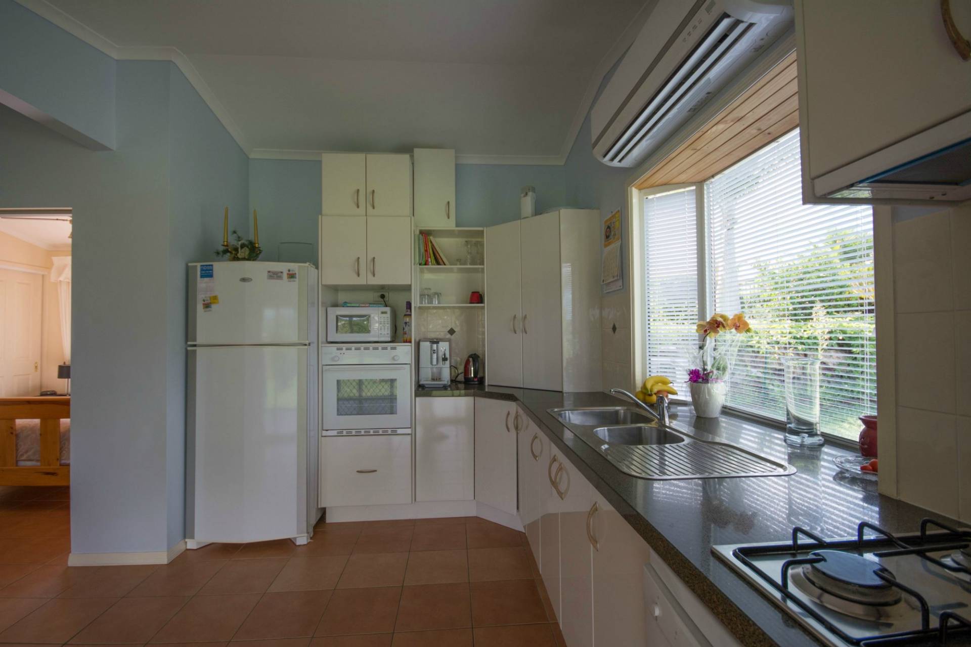 The smaller home has three generous sized bedrooms all built-in with the master having an ensuite, all three have ceiling fans and there’s a study nook for budding students or computer nerds. There’s an open plan kitchen/dining/lounge all tastefully decorated, a verendah runs the entire length of the home it could also double as carport. As you walk from the laundry there is a double carport which provides entry to the main driveway. This home is also fitted with ceiling fans, reversed cycle air conditioning and ADSL for computer connection.