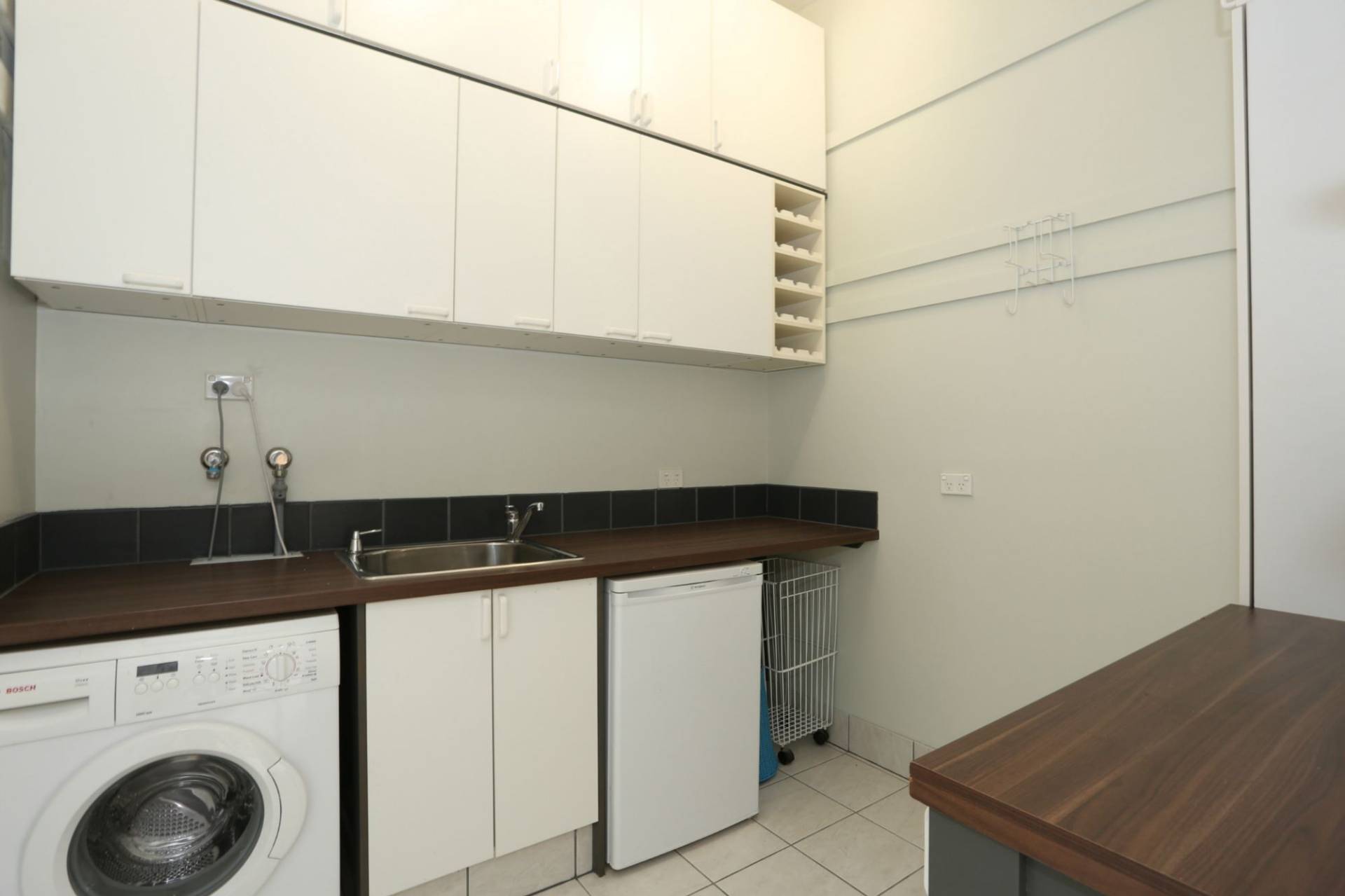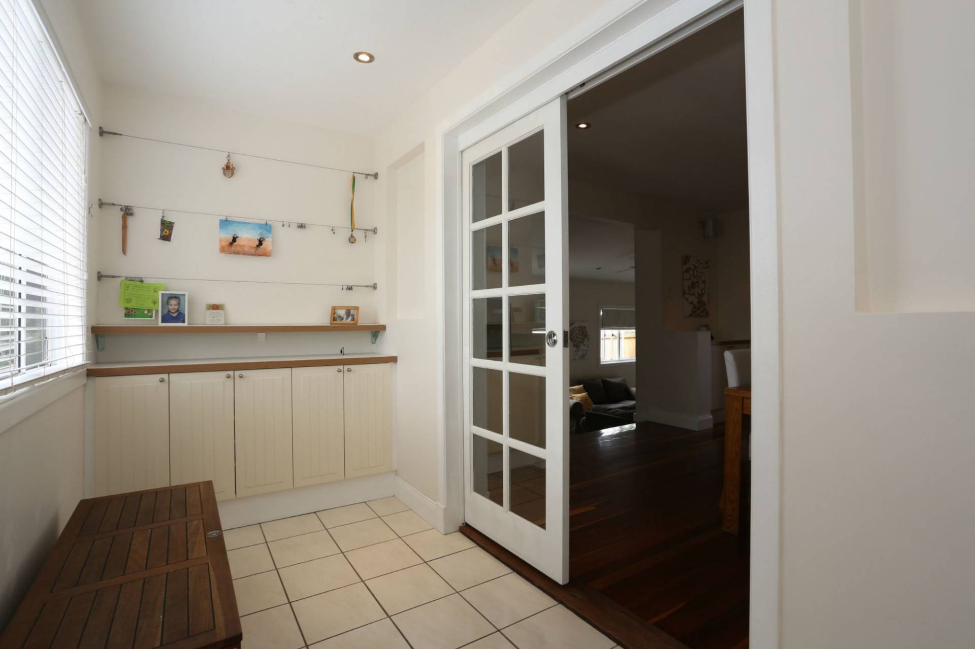 The bright well lit entry provides a wall for your photo gallery, a shoe cupboard and phone charger plug. Dividing 10 pane doors open to a functional and beautiful living area, Ikea kitchen with island bench, which flows through to a massive outdoor living, large enough for a casual lounge area. A separate sunken lounge area has high angled ceilings and leads to the large main bedroom with ensuite. There is a fourth bedroom and dream laundry with loads of cupboards on this level. A door leads to a beautifully paved drying area.