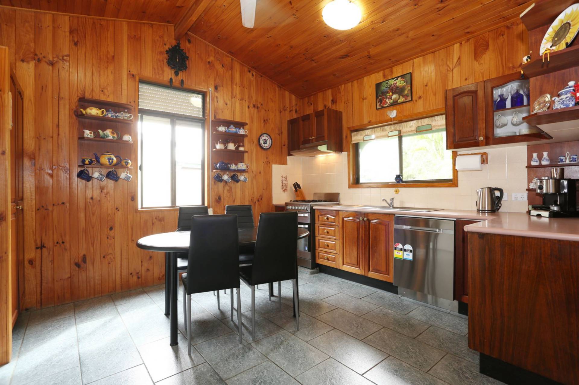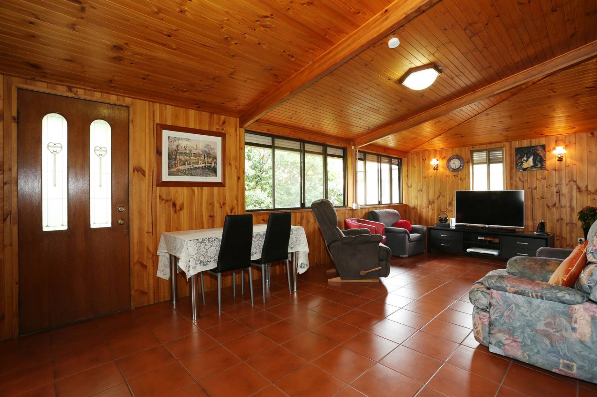 The spacious, open plan living and dining room is fully lined with polished timber VJs.