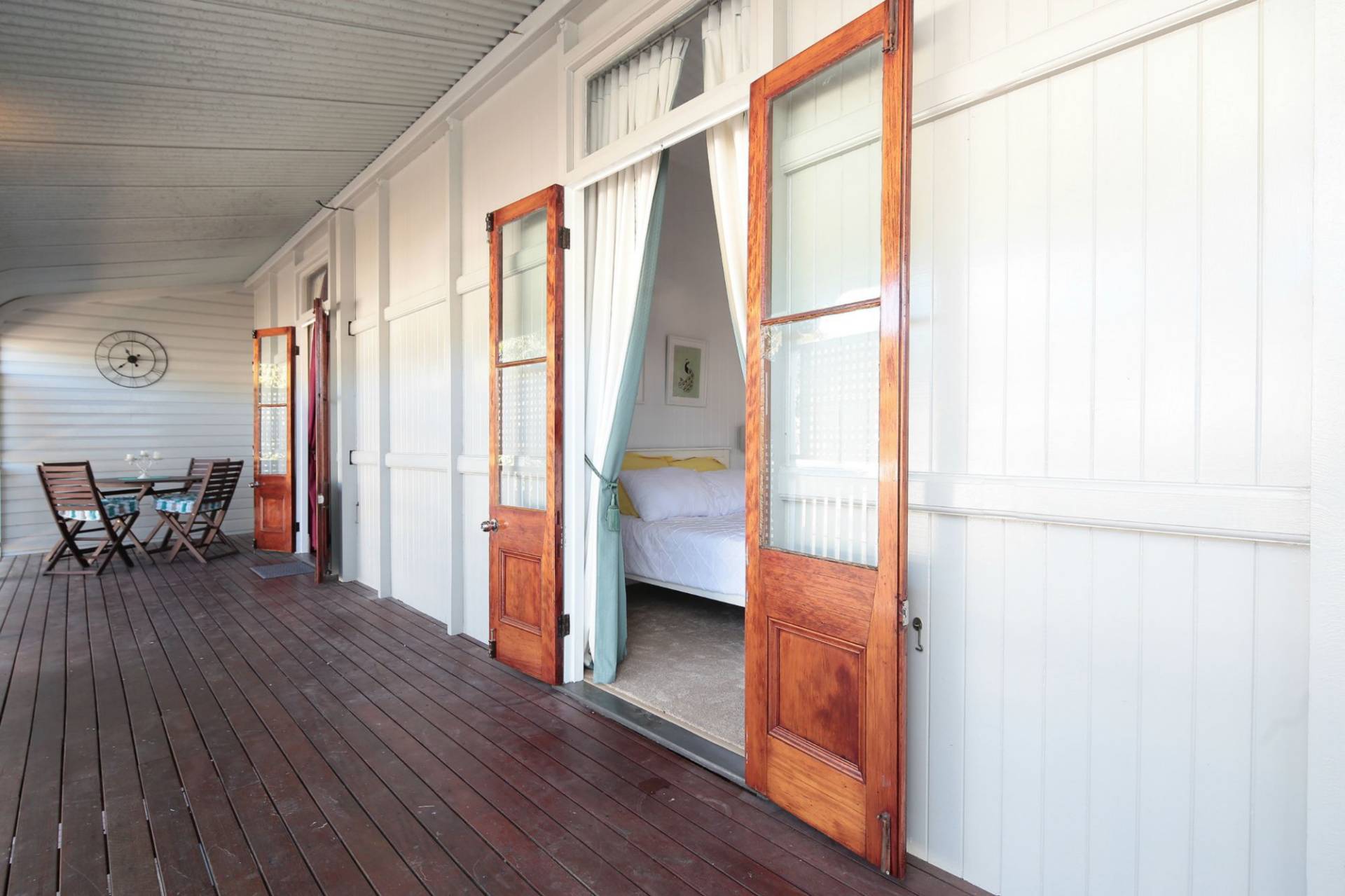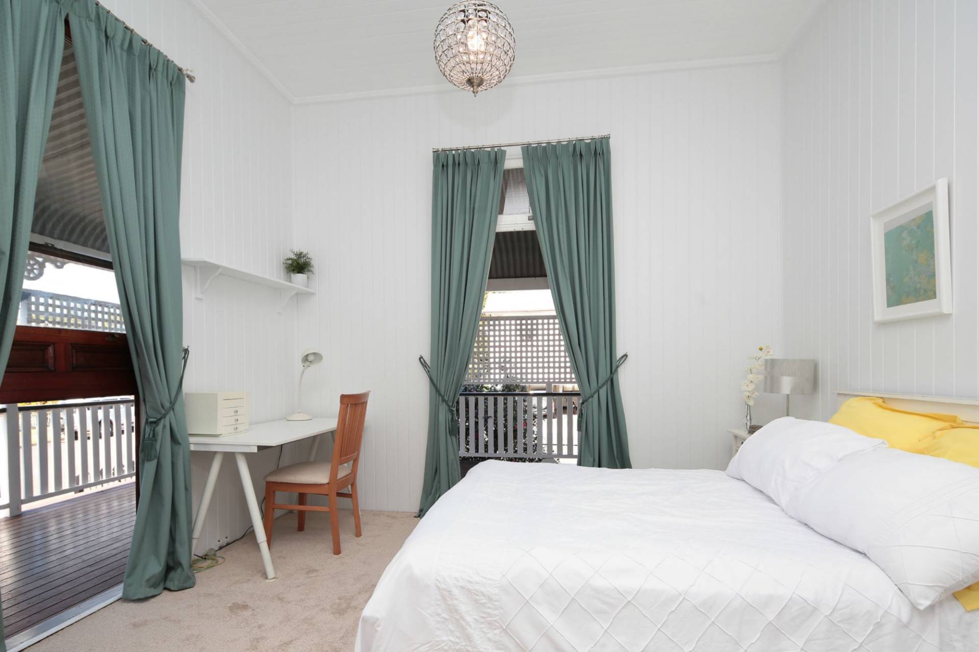 Crisp white colour scheme throughout highlights the timber french doors and honey coloured floors.